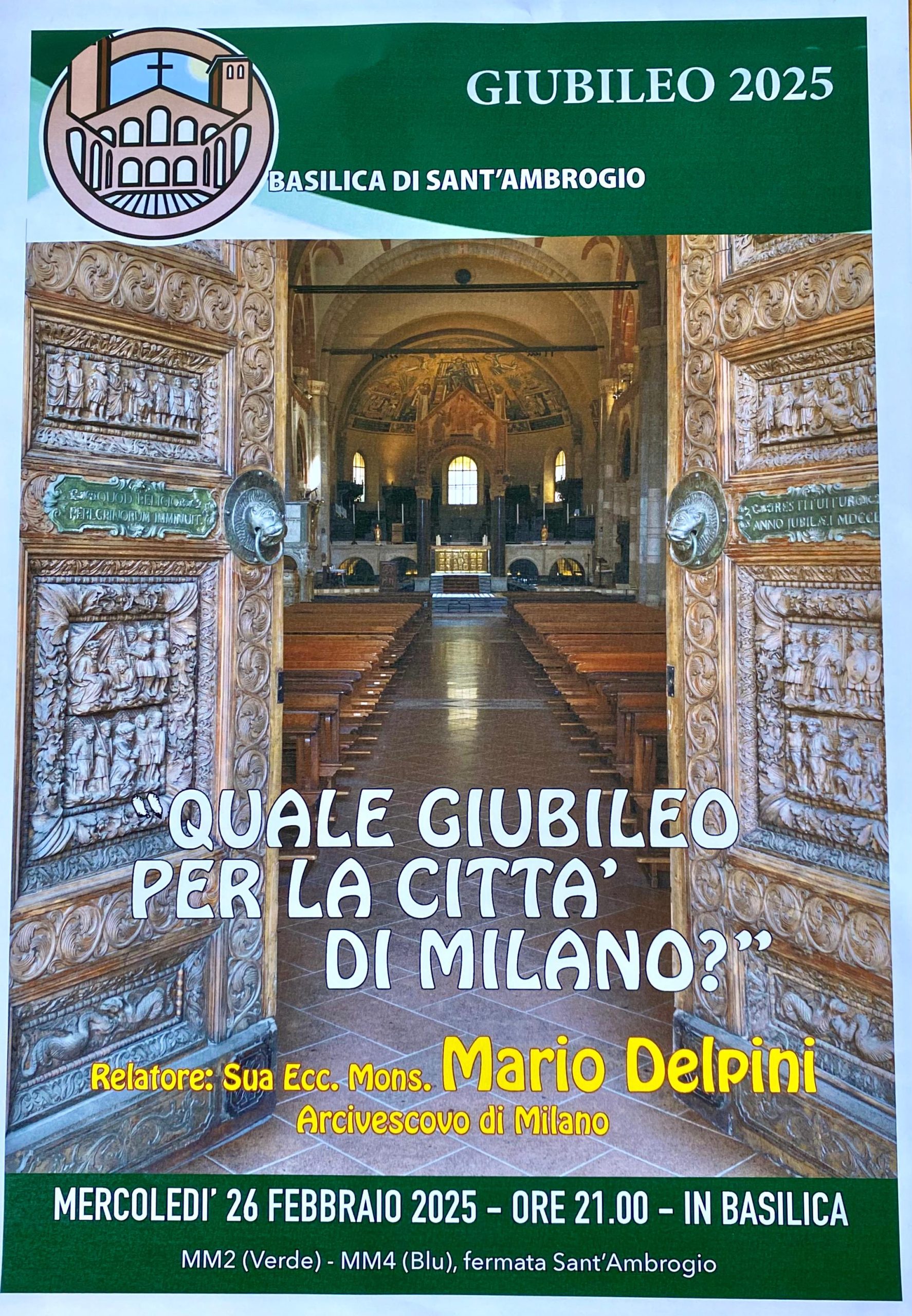 Mercoledì 26 febbraio alle ore 21, l’Arcivescovo di Milano terrà un incontro nella Basilica di Sant’Ambrogio, chiesa giubilare, dal titolo “Quale Giubileo per la citta di Milano?”. Tutti sono invitati a partecipare.