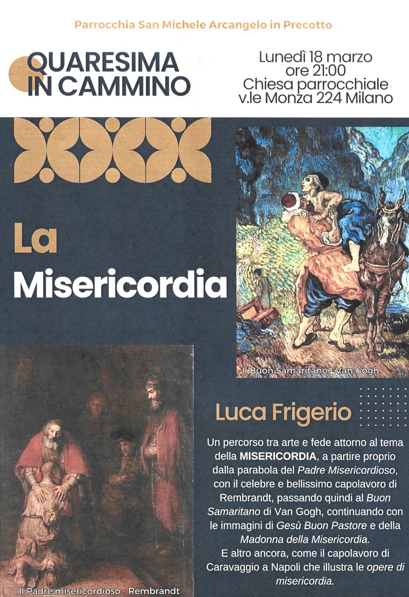 Lunedì 18 marzo alle 21 presso la chiesa parrocchiale di S. Michele Arcangelo di Precotto si terrà un incontro con il giornalista e scrittore Luca Frigerio sul tema della misericordia a partire dalla parabola del Padre misericordioso con il capolavoro di Rembrandt, il Buon samaritano di Van Gogh e altre immagini di Gesù Buon pastore e la Madonna della Misericordia.