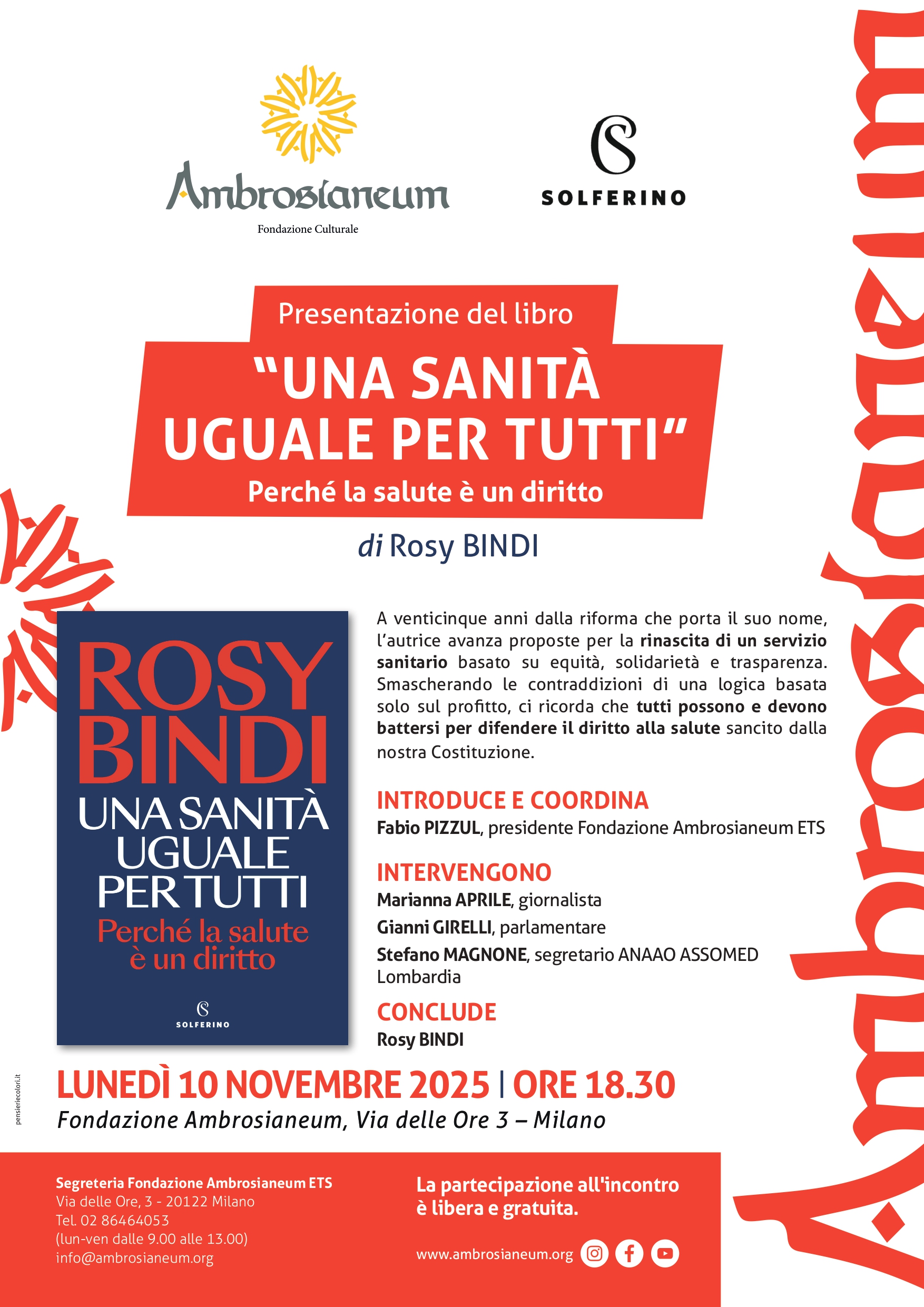 Lunedì 10 novembre alle 18.30 presso la sede dell’Ambrosianeum a Milano, si svolgerà un incontro con Rosy Bindi, Marianna Aprile, Gianni Girelli, Stefano Magnone e Fabio Pizzul sulla sanità pubblica.