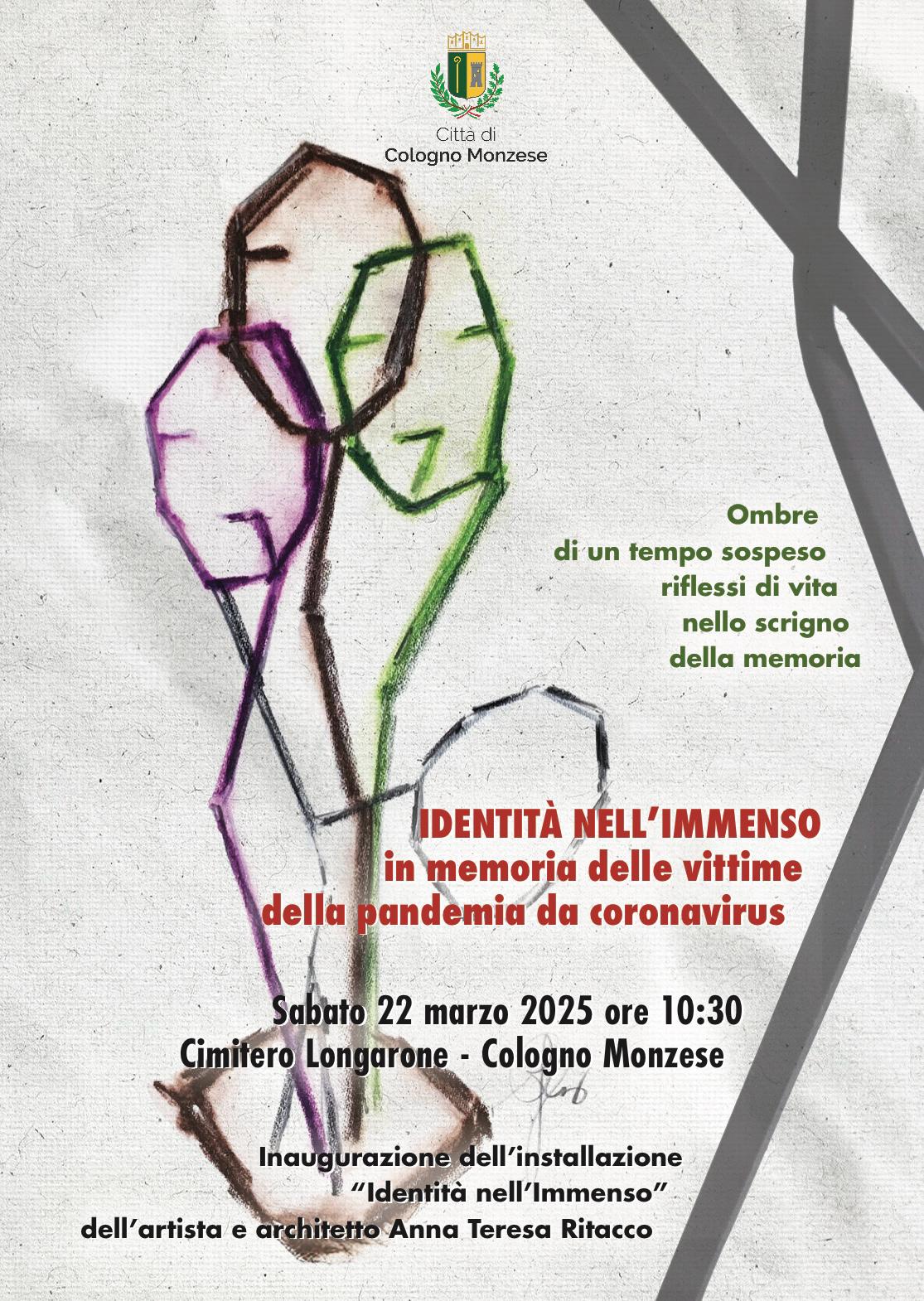 nell’immenso, realizzata dall’artista e architetto Anna Teresa Ritacco, nell’ambito dell’omonimo progetto del Comune di Cologno Monzese per celebrare la memoria delle vittime della pandemia di Coronavirus, sarà inaugurata sabato 22 marzo alle 10.30 all’ingresso del Cimitero Longarone.