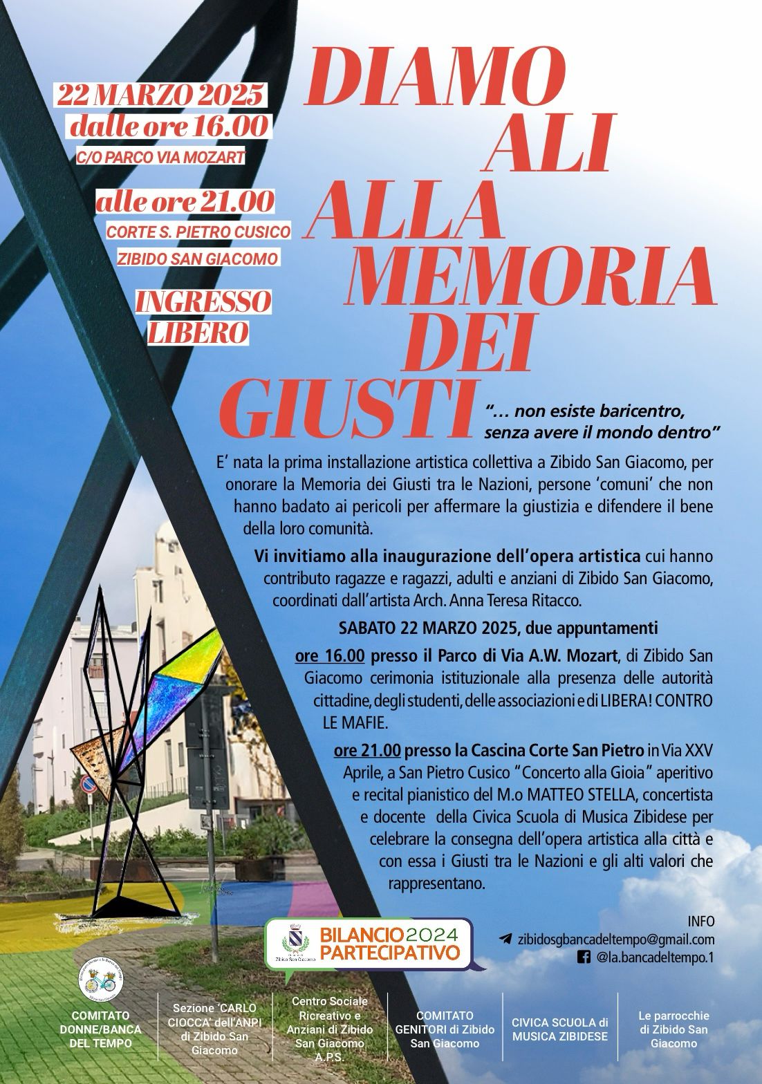 attraverso il Bilancio Partecipativo 2024, “Diamo ali alla memoria dei Giusti”, che verrà inaugurata sempre sabato 22 marzo alle 16:00, presso il Parco A.W. Mozart, Zibido