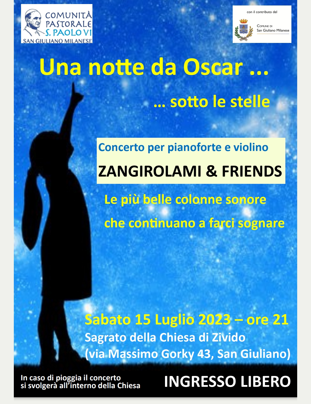 La Comunità Pastorale San Paolo VI di San Giuliano milanese invita tutti, sabato 15 luglio alle 21, sul sagrato della chiesa di Zivido, per vivere insieme “Una notte da Oscar…sotto le stelle”: un concerto per pianoforte e violino con i Zangirolami & Friends che proporranno l’ascolto delle più belle colonne sonore.
