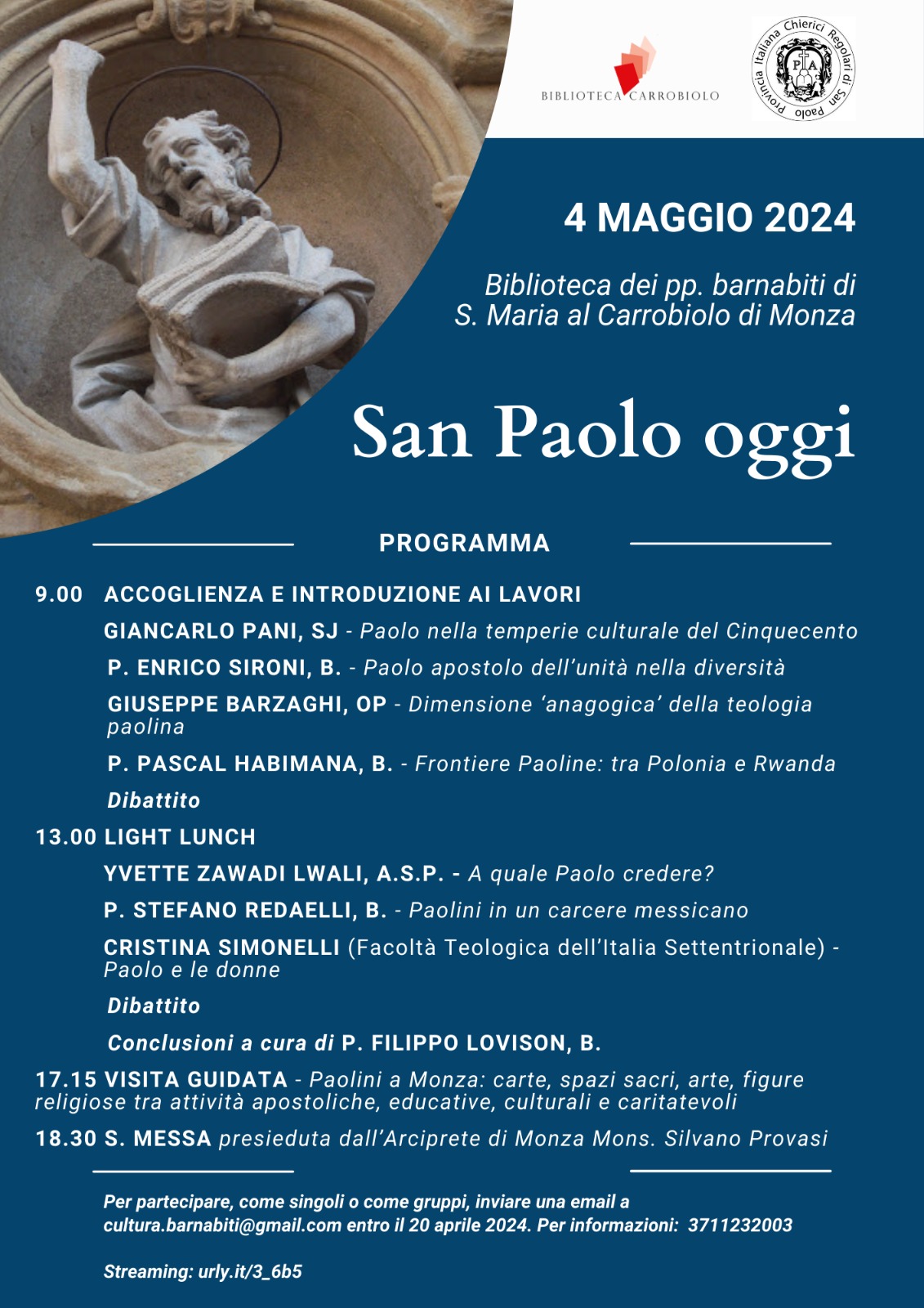 La Provincia Italiana dei Chierici Regolari di S. Paolo (Barnabiti) promuove la seconda edizione del convegno annuale sulla figura di San Paolo, figura ispiratrice del carisma della Congregazione. Lo scenario della Biblioteca del Carrobiolo di Monza, luogo in cui la Provincia ha deciso di concentrare molto del proprio materiale culturale, accoglierà tre importanti relatori che verranno affiancati dal racconto di alcune esperienze condotte da membri della Congregazione in giro per il mondo.