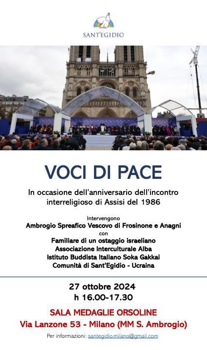 Domenica 27 ottobre alle 16, presso la chiesa di San Bernardino (via Lanzone 13 a Milano), si terrà un incontro per parlare di pace con monsignor Ambrogio Spreafico – vescovo di Frosinone e Anagni e ascoltare le testimonianze da un familiare di un ostaggio israeliano.