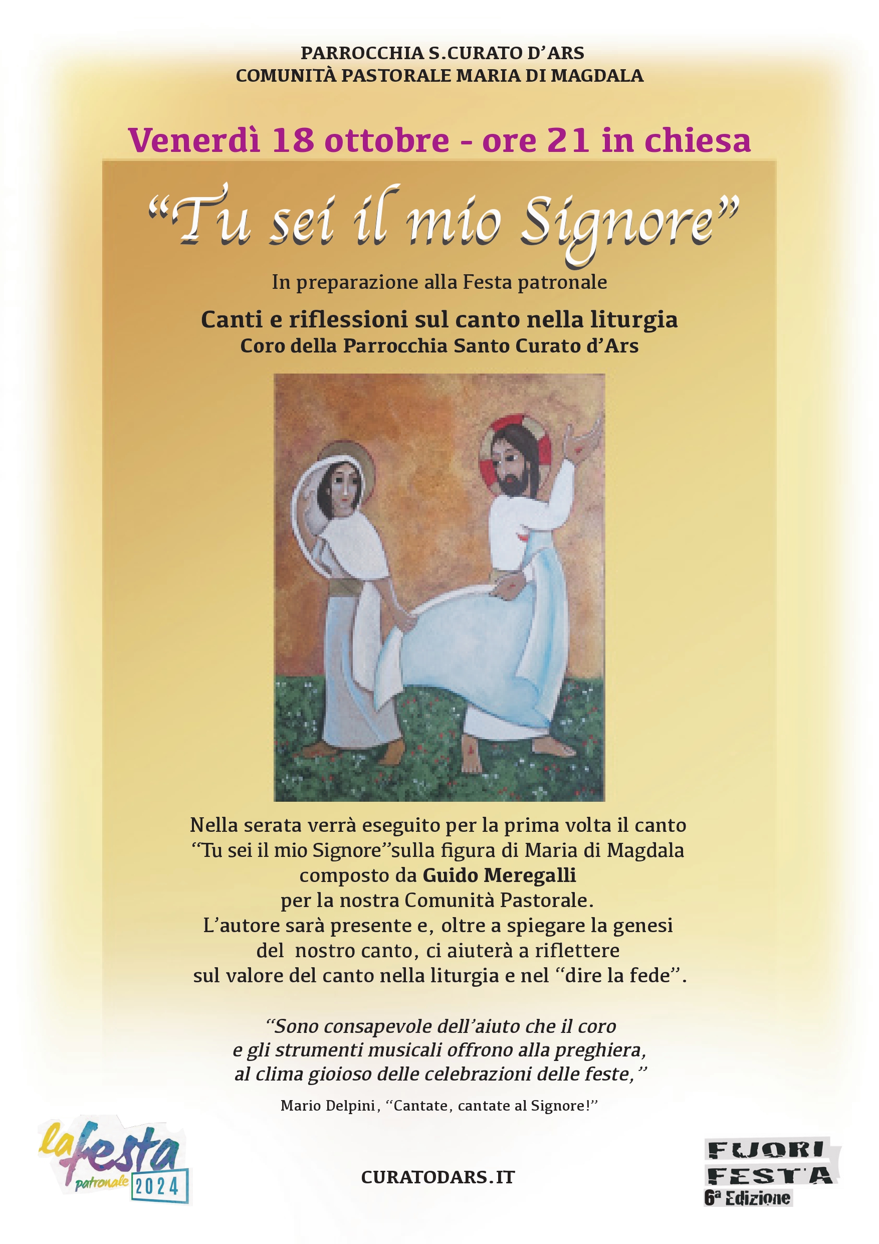 Nella serata verrà eseguito per la prima volta il canto “Tu sei il mio Signore” sulla figura di Maria di Magdala, composto da Guido Meregalli che spiegherà la genesi e aiuterà a riflettere sull’importanza del canto nel dire la Fede.