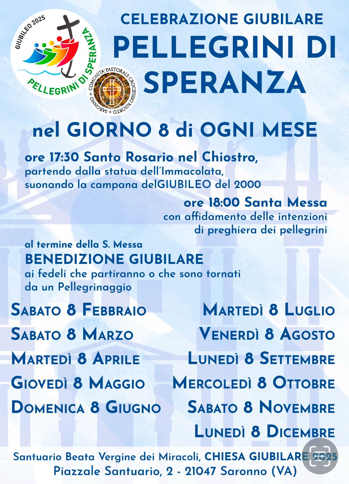 Il Santuario – che è Chiesa Giubilare della Diocesi – in questo Anno Santo della Speranza organizza ogni ‘giorno 8 del mese’ una speciale celebrazione, partendo dal Chiostro con la preghiera del Rosario alle 17.30 (contemplando stavolta i “Misteri di Pietro e della Chiesa”, a sei mese dall’elezione del Papa), arrivando poi in Santuario con i flambeaux accesi per la S. Messa delle ore 18, con il gesto dell’affidamento di tutte le intenzioni di preghiera scritte dai pellegrini alla Madonna dei Miracoli. Al termine della celebrazione – oltre alla preghiera per papa Leone – viene data la speciale “benedizione giubilare” preparata dai Vescovi della Lombardia per l’accoglienza ed il congedo durante i pellegrinaggi giubilari. È suggerita anche per quei gruppi o quei singoli che partiranno per attraversare la Porta Santa, oppure che sono tornati da Roma.