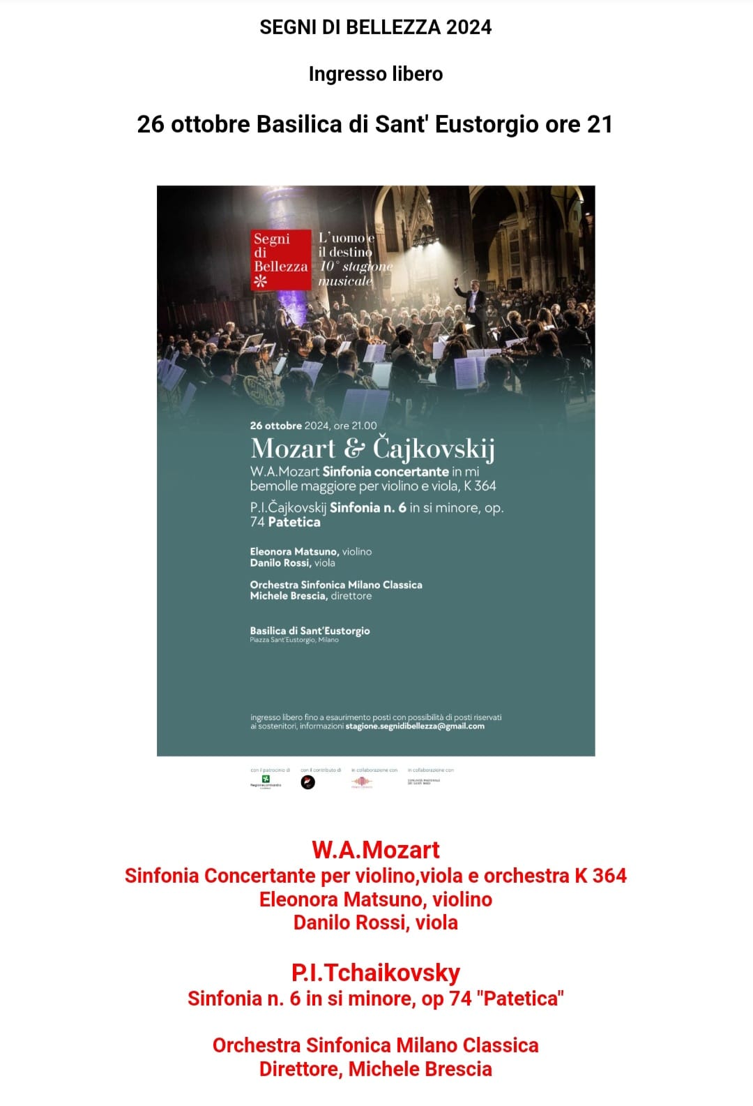 «E’ un programma di grande pathos quello che presentiamo in questo primo appuntamento – spiegano gli organizzatori -. Nonostante il cambio di programma dal “violino” di Tchaikovsky alla “Concertante” di Mozart il clima “patetico” della serata ci porterà dritti dritti al cuore del tema che vogliamo approfondire, quello del destino. Lo faremo grazie alla presenza di due solisti che ben rappresentano il ricco tessuto musicale milanese nel mondo: Eleonora Matsuno (violino di spalla dell’Orchestra Milano Classica e primo violino del Quartetto “Indaco”) e Danilo Rossi (prima viola dell’orchestra del Teatro alla Scala)».