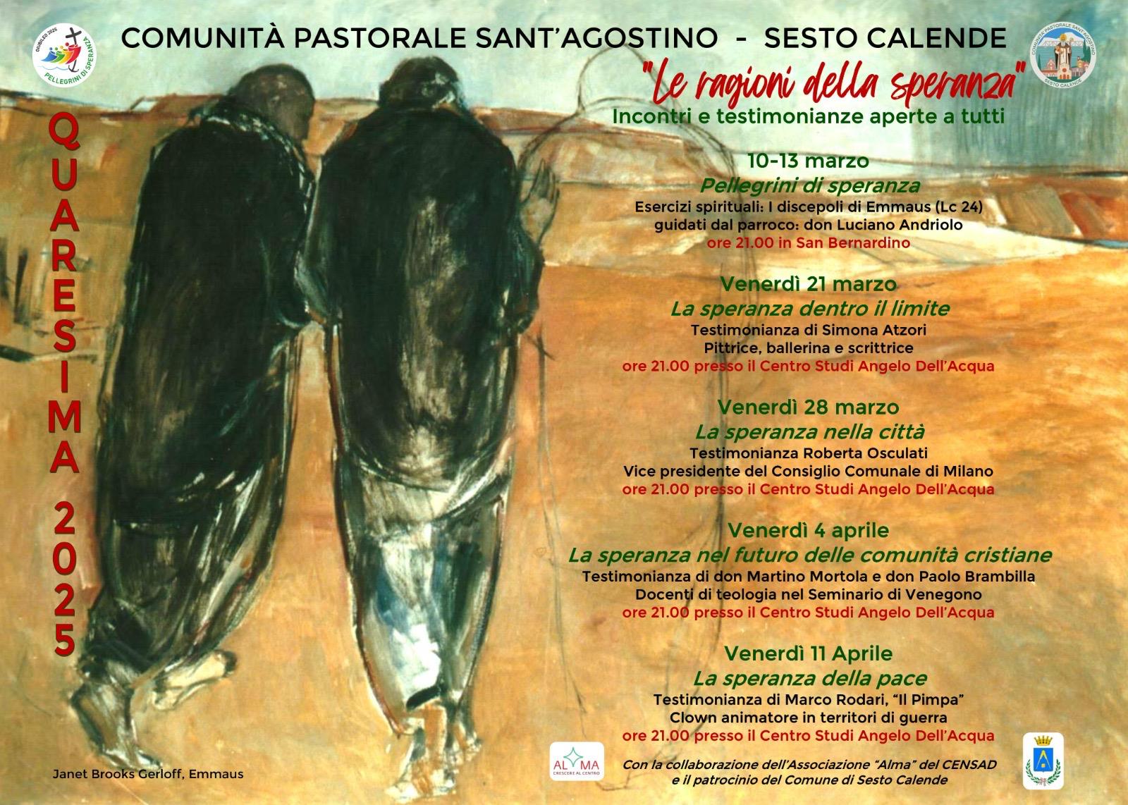 In occasione della Quaresima 2025, la Comunità Pastorale Sant’Agostino di Sesto Calende propone quattro incontri dal titolo “Le ragioni della speranza” con la presenza di testimoni significativi che parleranno della loro esperienza in alcuni contesti particolari di vita: nella disabilità, nella città, nella comunità cristiana, nelle zone di guerra. Questi incontri, che hanno il patrocinio del Comune di Sesto Calende, intendono far riflettere tutti su un tema – quello della speranza – che interpella ogni persona, anche chi non si riconosce nella visione cristiana.