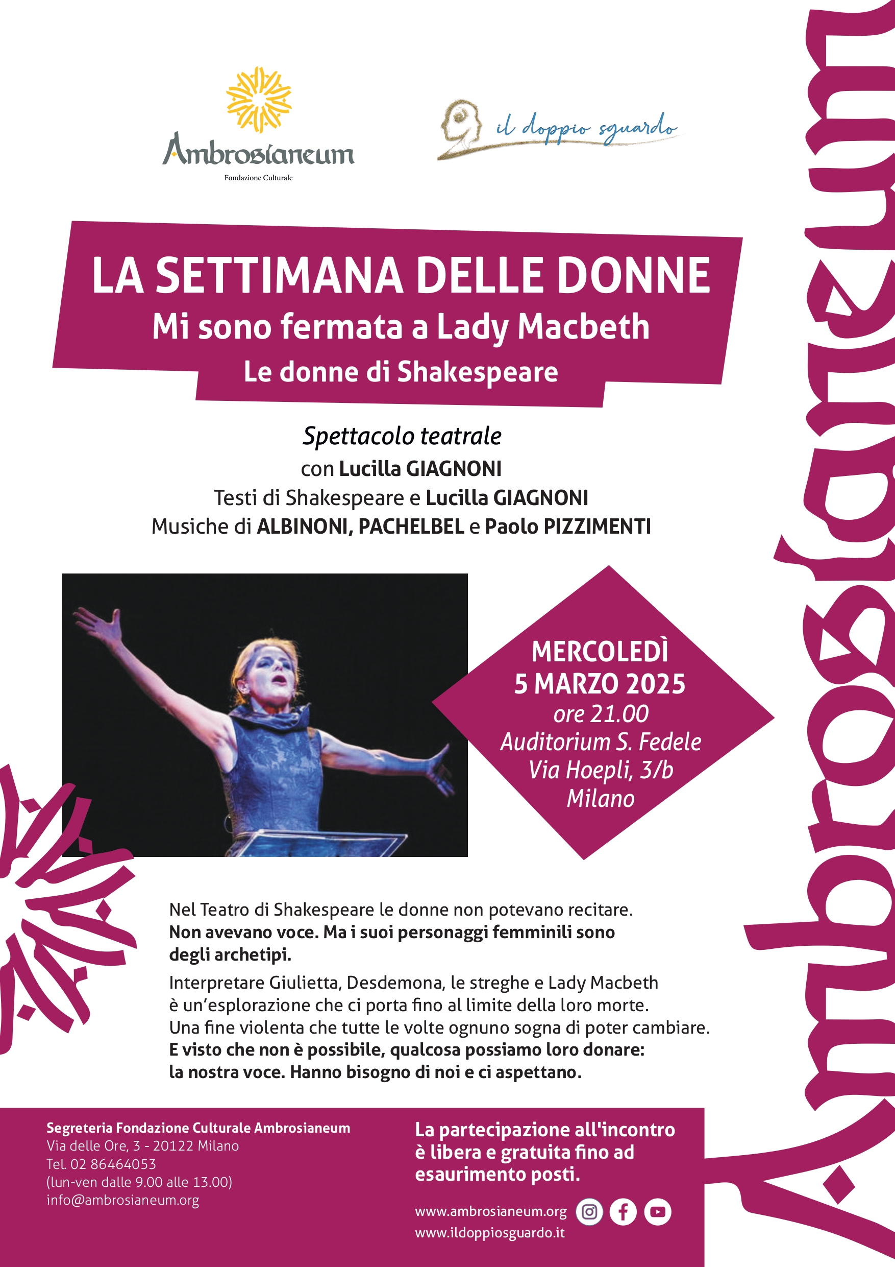Mercoledì 5 marzo alle 21 presso l’Auditorium San Fedele di Milano, la Fondazione Ambrosianeum e l’Associazione Il Doppio Sguardo, in occasione della Settimana delle Donne, presentano lo spettacolo teatrale “Mi sono fermata a Lady Macbeth – le donne di Shakespeare”, con l’attrice Lucilla Giagnoni.