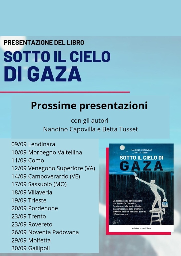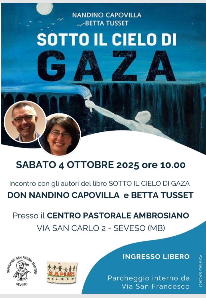 Sabato 4 ottobre alle 10 al Centro Pastorale di Seveso si terrà la presentazione del libro “Sotto il cielo di Gaza” (Edizioni La Meridiana).