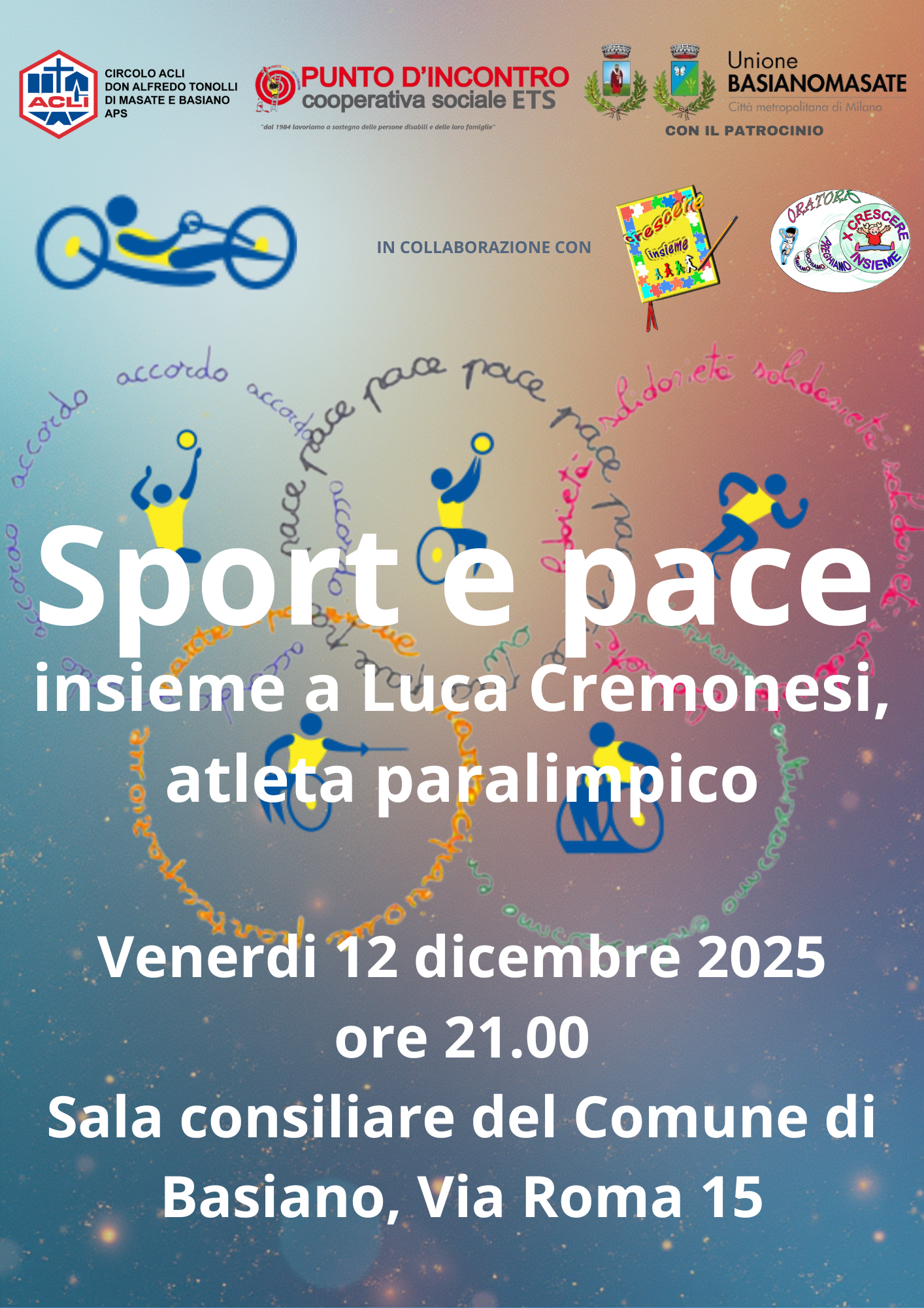 Appuntamento con “Il cammino della pace”, insieme a Luca Cremonesi, atleta paralimpico di handbike in programma il 12 dicembre alle 21 presso la Sala Consiliare del Comune di Basiano in via Roma 15.