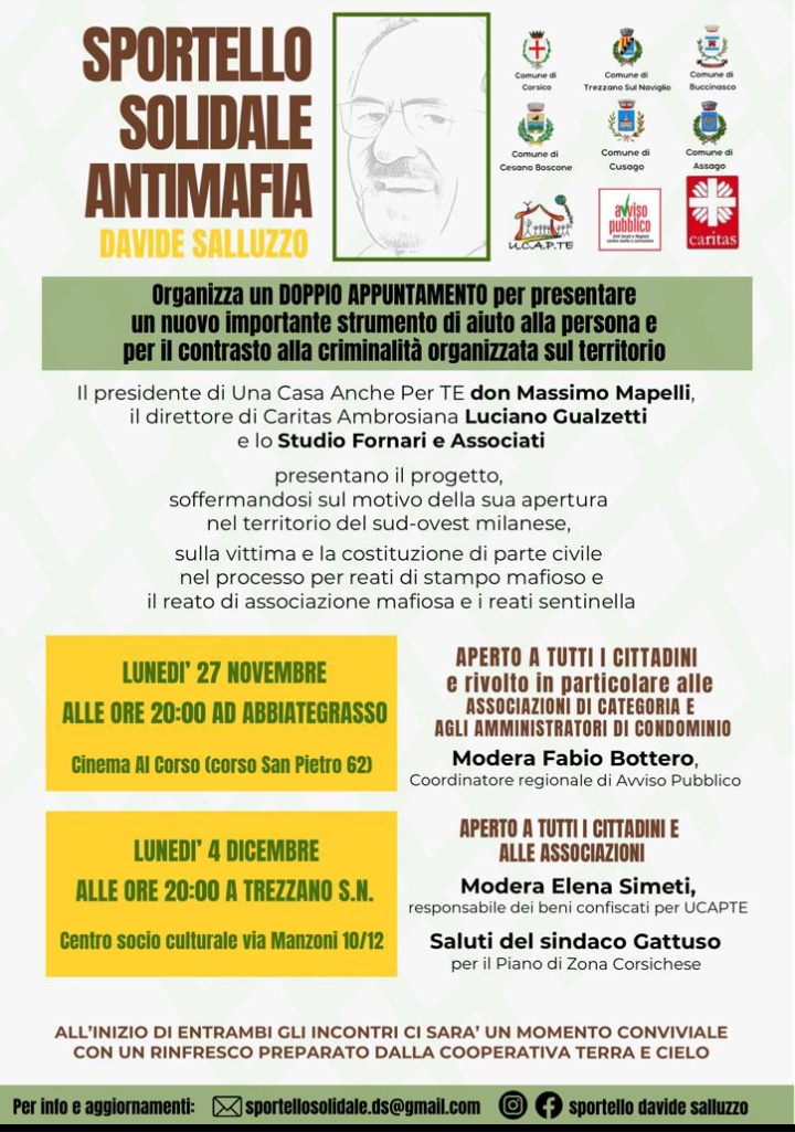 Sportello solidale antimafia Davide Salluzzo organizza una serata per presentare un nuovo importante strumento di aiuto alla persona e per il contrasto alla criminalità organizzata sul territorio.