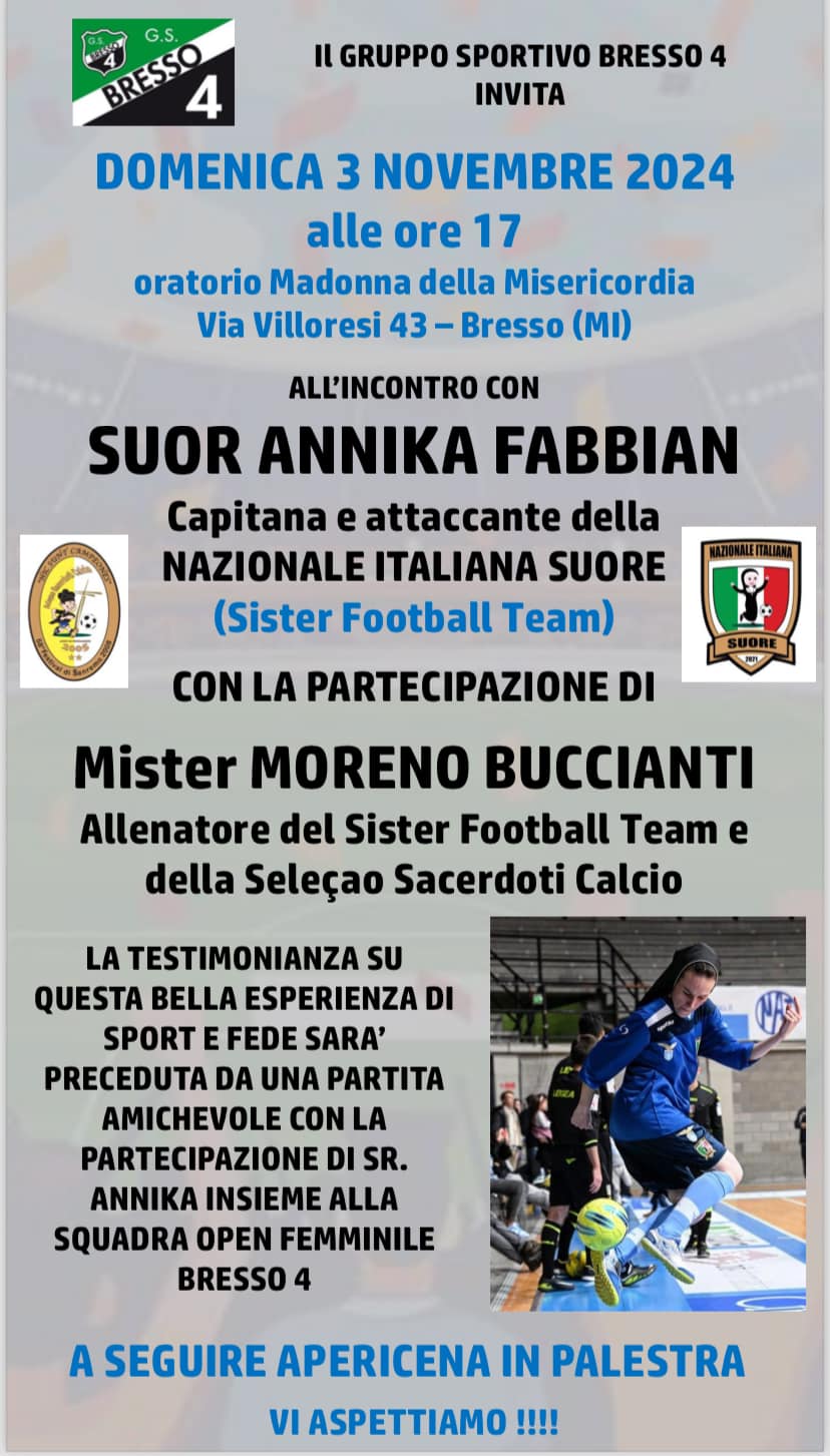 Domenica 3 novembre alle 17 presso l’Oratorio Madonna della Misericordia di Via Villoresi 43 a Bresso, l’A.S.D. G.S. Bresso 4 invita a un incontro-testimonianza con Suor Annika Fabbian, capitana e attaccante della Nazionale Italiana Suore  (Sister Football team).
