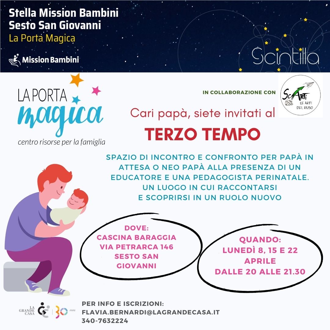 Uno spazio aperto a ogni uomo che sia padre o sia in attesa di diventarlo per esplorare il concetto di paternità e i cambiamenti che ne derivano, offrendo ai partecipanti un luogo dedicato per condividere le gioie, i dubbi e le difficoltà che l’essere padre comporta, con altri uomini che attraversano fasi simili. Nasce così Terzo Tempo, il progetto promosso da La Grande Casa scs e Mission Bambini nell’ambito di “Scintilla”, progetto avviato dalla Fondazione e dedicato a oltre 200 bambini della fascia di età 0-6 anni e alle loro famiglie.