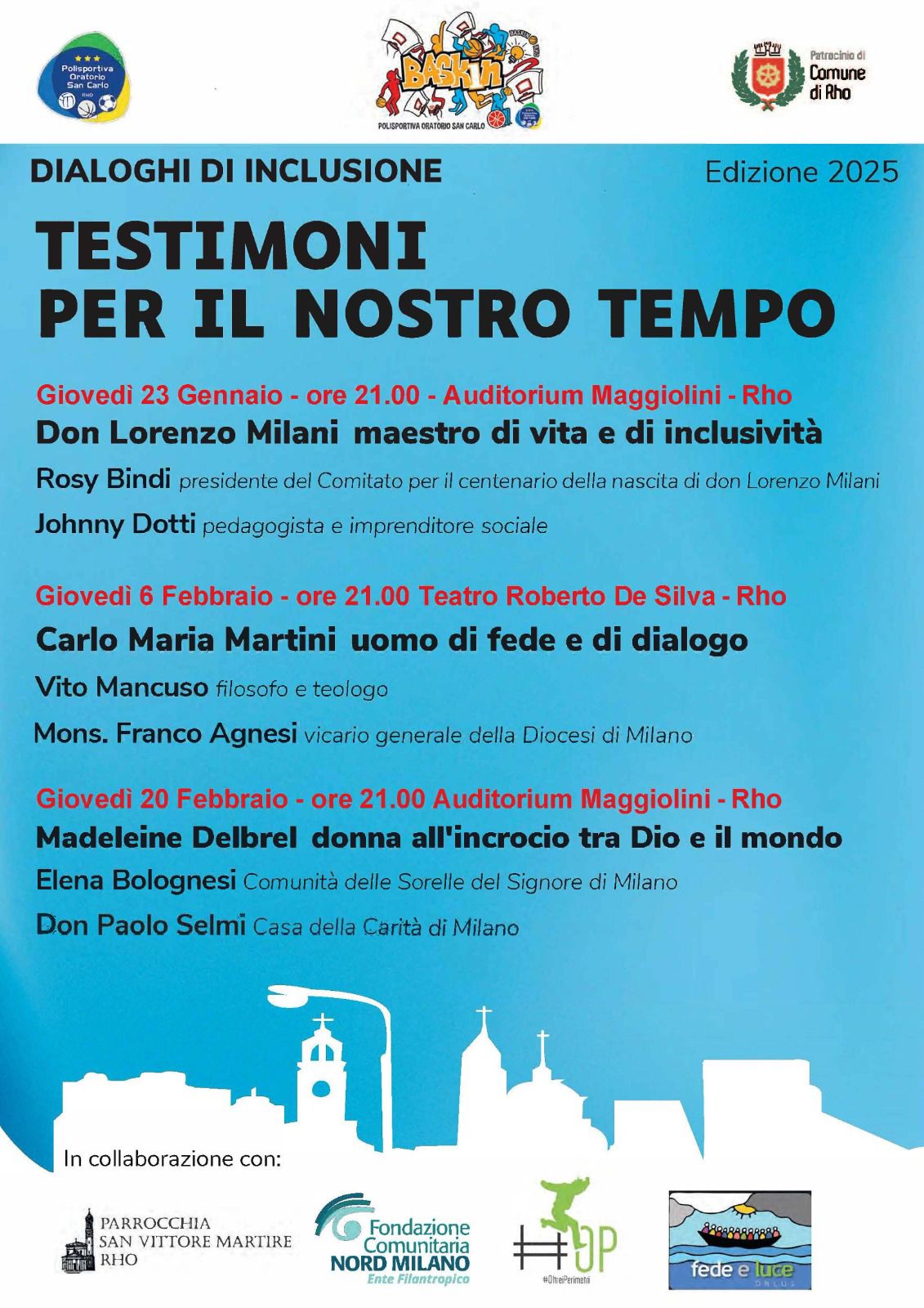 Giovedì 23 gennaio alle 21, presso l’Auditorium Maggiolini di Rho, prenderà il via la rassegna “Dialoghi di inclusione” proposta dalla Polisportiva Oratorio San Carlo ASD-APS, in collaborazione con Fede e Luce e la Parrocchia San Vittore, con il contributo della Fondazione Comunitaria Nord Milano e il patrocinio del Comune di Rho.