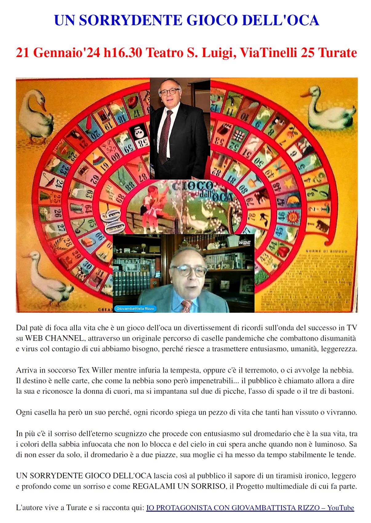 Domenica 21 gennaio alle 16.30 al Teatro San Luigi di Turate debutto di Gianni Rizzo con il suo spettacolo «Un sorrydente gioco dell’oca»  che regalerà entusiasmo, umanità e leggerezza.