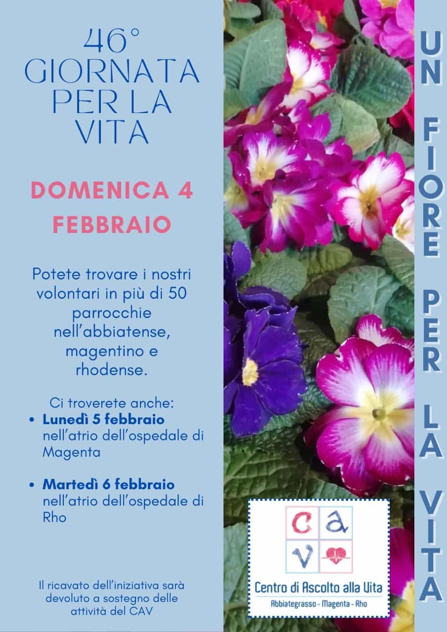 Domenica 4 febbraio, in occasione della 46° Giornata per la Vita, il Centro di Ascolto alla Vita di Abbiategrasso sarà presente in più di 50 parrocchie del Magentino, Abbiatense e Rhodense per offrire le primule della vita e materiale divulgativo per far conoscere le attività del Cav.
