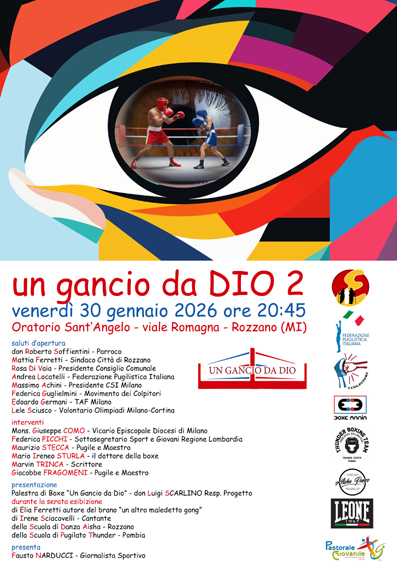 Venerdì 30 gennaio alle 20.45, presso l’Oratorio Sant’Angelo di Rozzano, appuntamento con “Un Gancio da Dio 2”, una serata di incontro, sport e valori che unisce pugilato, comunità e testimonianze importanti, per festeggiare l’anniversario del primo anno di vita di questo progetto della pastorale giovanile di Rozzano, che per ora ha coinvolto 50 giovani e giovanissimi, ragazze e bambine comprese.