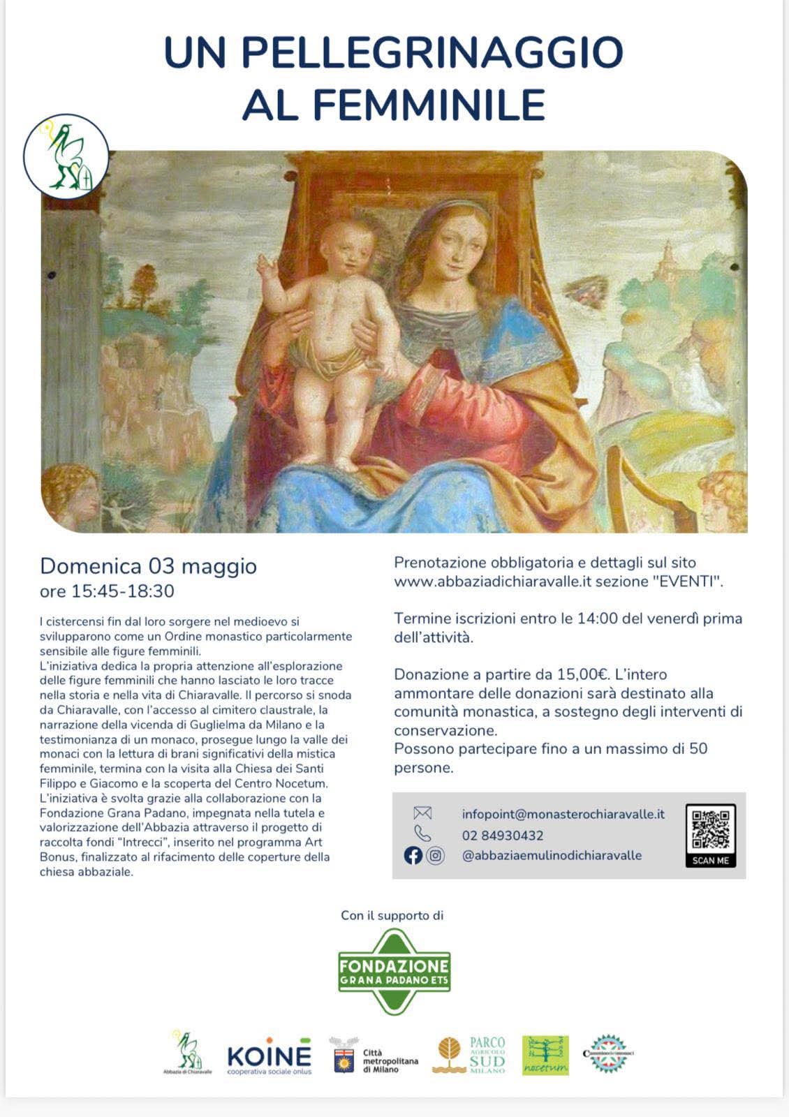 Il pellegrinaggio si apre con una visita all’Abbazia di Chiaravalle incentrata sulle figure femminili cui l’Ordine cistercense e i monaci di Chiaravalle sono stati particolarmente devoti. Particolare risalto ha chiaramente la figura di Maria e le rappresentazioni iconografiche a lei dedicate, comprendenti il ciclo giottesco del suo Transito, la Madonna con santi cistercensi affrescata nel chiostro da Callisto Piazza, la Pala d’Altare del Sojaro in Sala del Capitolo e la Madonna della Buonanotte di Bernardino Luini. Il viaggio, dipanandosi all’interno del mondo femminile, si allarga alla visita della cappella di Maria Maddalena e alle varie cappelle raffiguranti i personaggi femminili protagonisti dei testi biblici. Per questa unica occasione viene aperto il cimitero medievale della comunità monastica, luogo di stretta clausura, ove è ancora visibile la cappella funeraria che un tempo ospitava le spoglie di Guglielma da Milano, che nella seconda metà del Duecento fu particolarmente legata ai monaci di Chiaravalle tanto da essere l’unica donna della storia ad avere il privilegio di sepoltura all’interno del monastero.