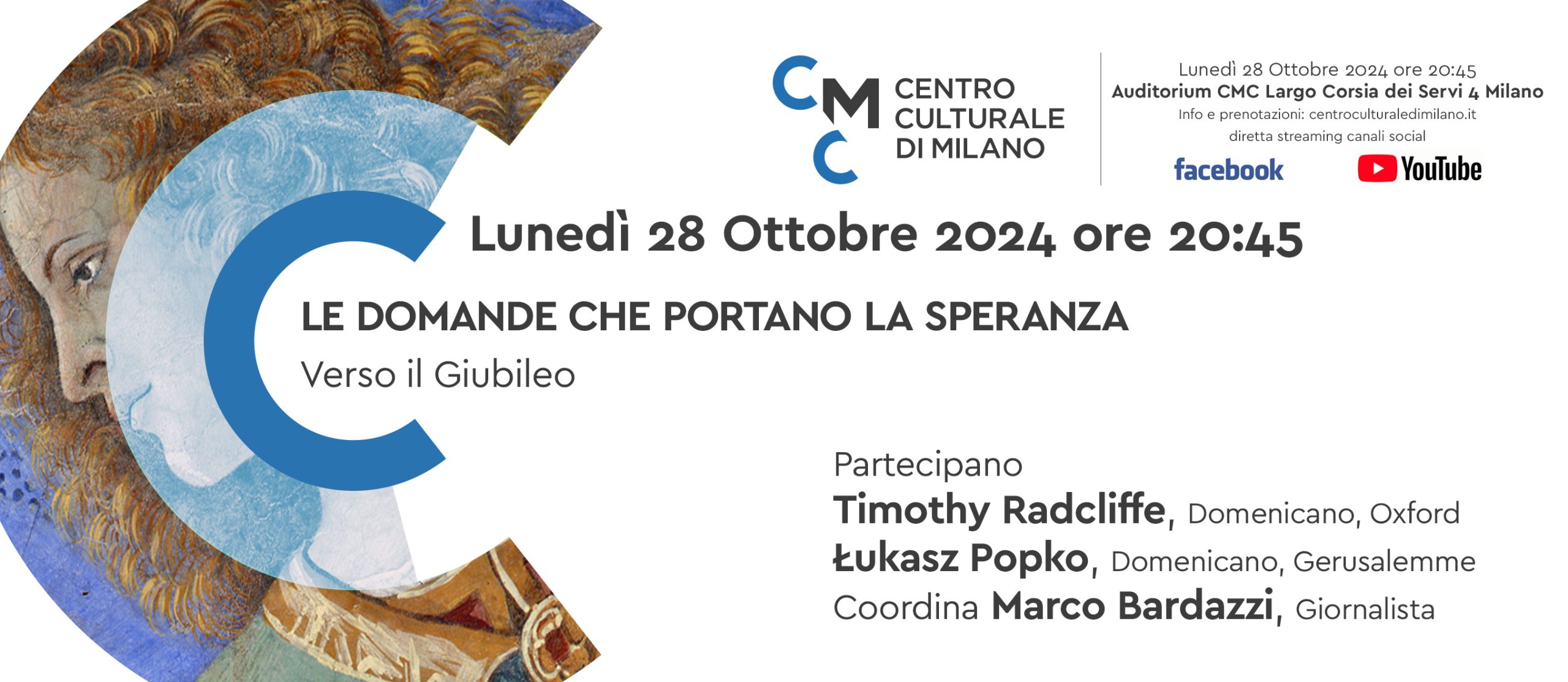Il Centro Culturale di Milano organizza una serata di dialogo sui temi del Giubileo della Speranza, e lo fa con due teologi e biblisti, amici tra loro, per mettere in luce quella relazione di domande, risposte, tra l’uomo e il Mistero di Dio così come la Bibbia e il nuovo Testamento documentano. Il teologo inglese di fama internazionale – che verrà creato Cardinale da Papa Francesco il prossimo 7 dicembre 2024- e di ritorno dal Sinodo di Roma insieme al giovane biblista docente a Gerusalemme, incalzati dal giornalista Marco Bardazzi, si confronteranno con le sfide e le domande nuove sorte nel nostro tempo di incertezza e di nuove speranze. Perchè “il cristianesimo si è sempre posto vicino a chi cerca, a chi si interroga” (Papa Francesco)