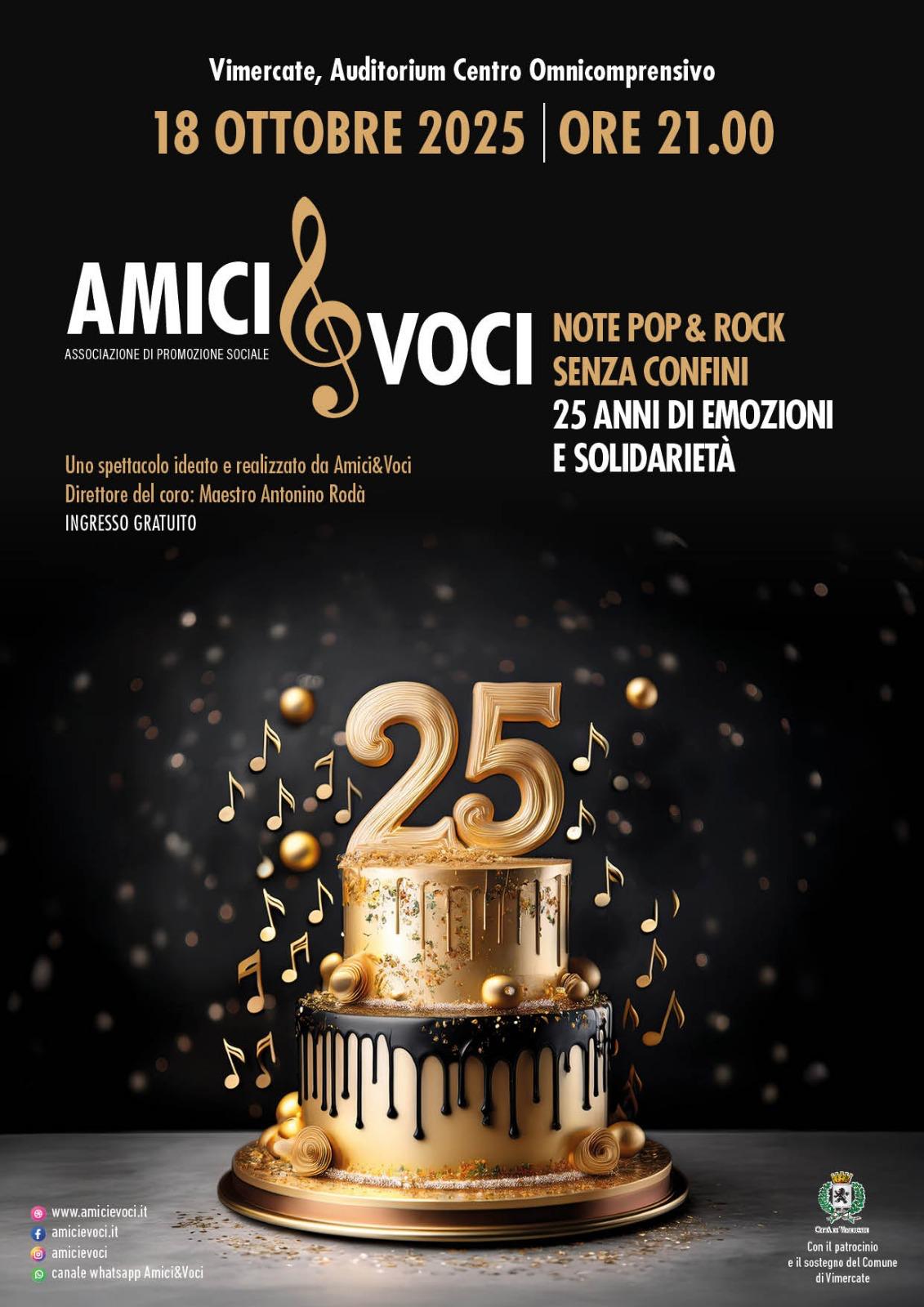 Sabato 18 ottobre a Vimercate il coro Amici&Voci festeggia un importante compleanno e per l’occasione ha preparato un concerto gratuito diretto dal maestro Antonino Rodà: un viaggio musicale che ripercorrerà tutta la loro storia. Non sarà solo un concerto, ma un abbraccio di ricordi, emozioni e musica.