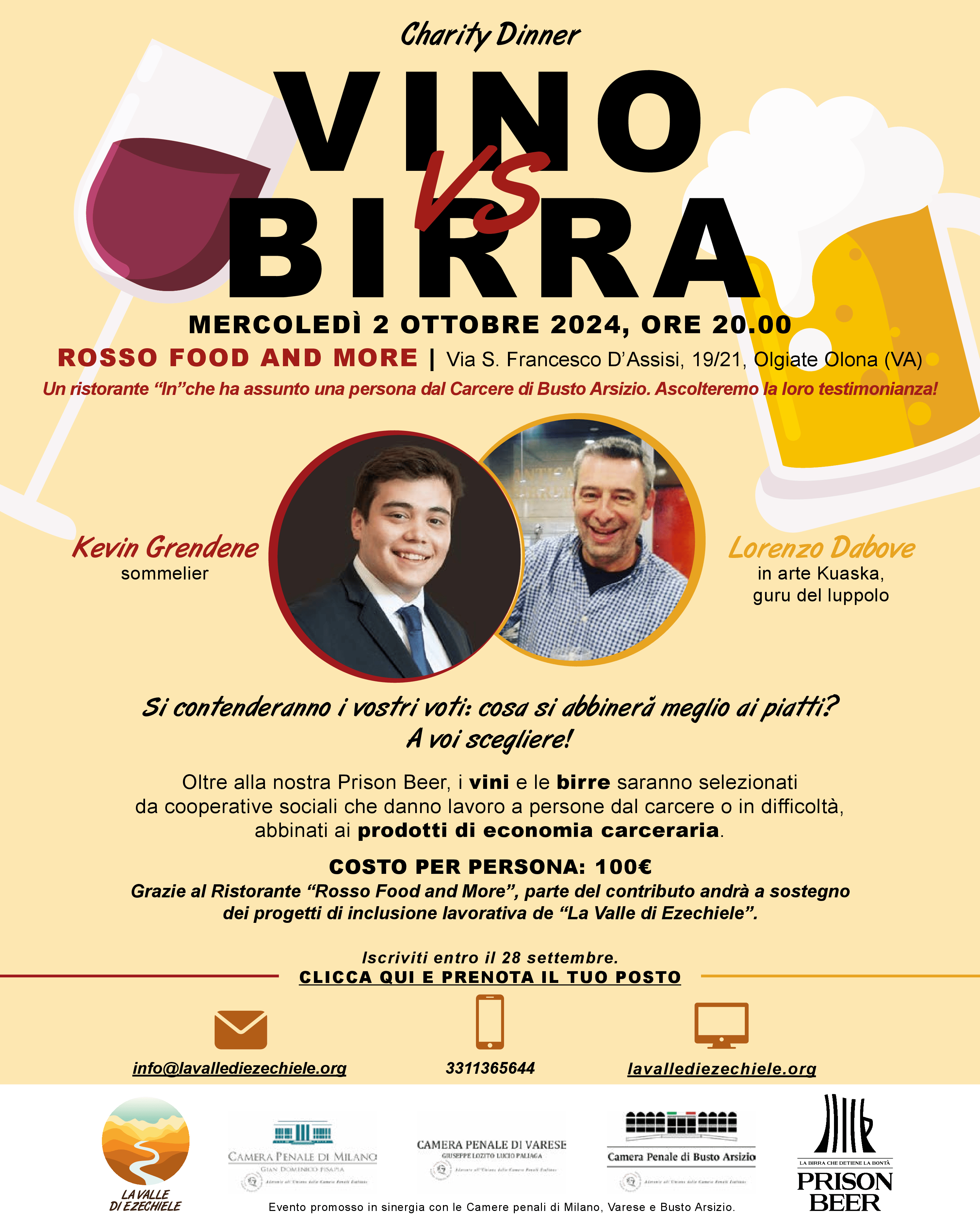 La serata si pone con un tratto ludico, dentro una sfida tra due campioni: da una parte Kevin Grendene, sommelier che sempre collabora con il Silvio Salmoiraghi del Ristorante stellato Acquerello di Fagnano Olona e ora con altri pregiati chef televisivi. Dall’altra Lorenzo Dabove, in arte Kuaska, il più quotato giudice internazionale di birre, che ha eccezionalmente ricettato la Prison beer: il volto brassicolo de La Valle di Ezechiele, prodotta in collaborazione con il birrificio The Wall. I presenti potranno stabilire cosa meglio si abbinerà ai singoli piatti: se la il vino la birra scelti dai due campioni della serata. Birre e vini saranno scelti in prevalenza da prodotti di cooperative carcerarie o sociali.