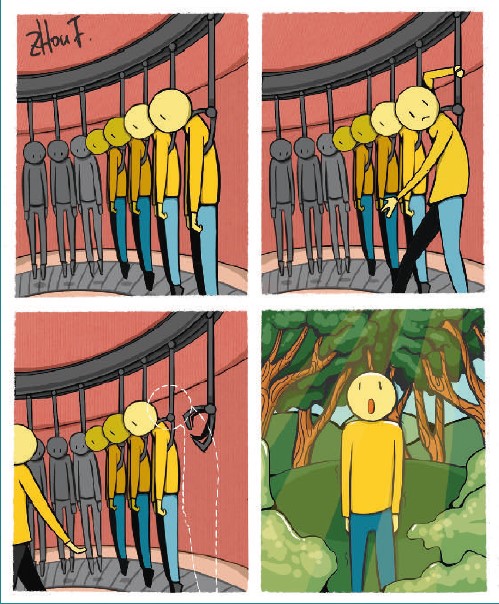 “Vita vuota” è una collezione di fumetti muti a 4 vignette che “non hanno linguaggio ma hanno un’anima”, il contributo che l’artista, giovane trentenne, vuole dare alla cura della depressione, problema molto presente in Cina come in Italia.