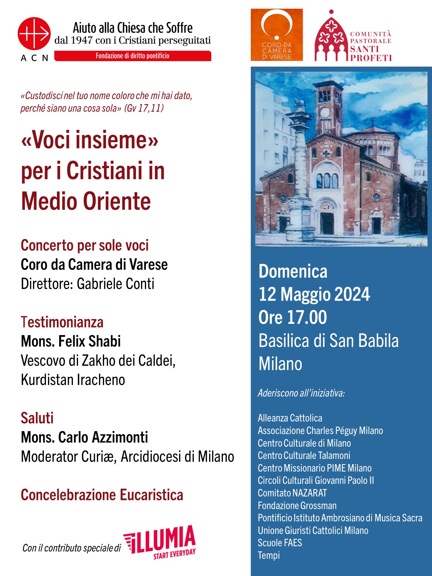 Domenica 12 maggio alle 17 si tiene in Basilica di San Babila un concerto-testimonianza a sostegno dei Cristiani in Medio Oriente, promosso da Aiuto alla Chiesa che Soffre (ACS) con l’adesione di 12 realtà educative, culturali e associative di Milano.