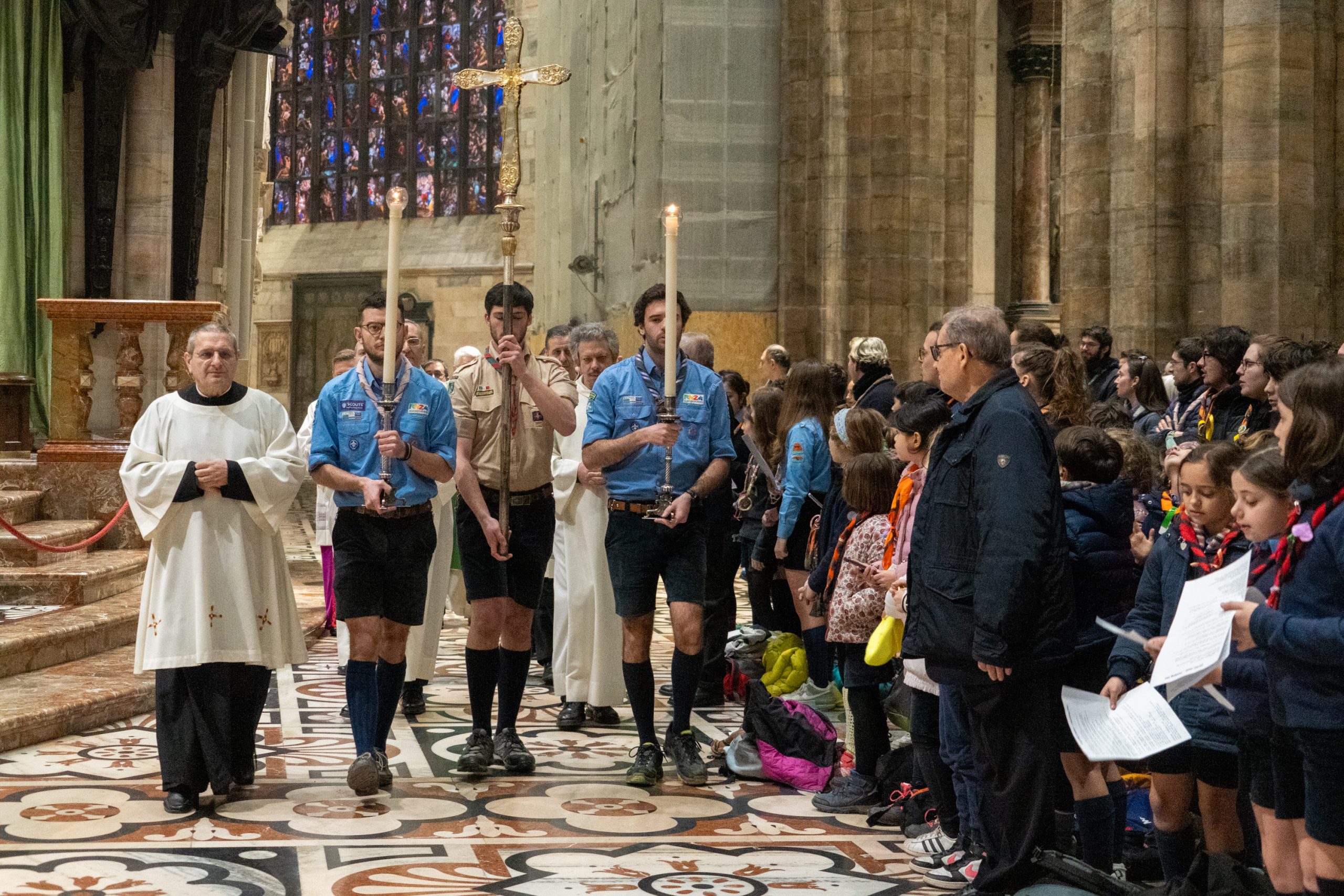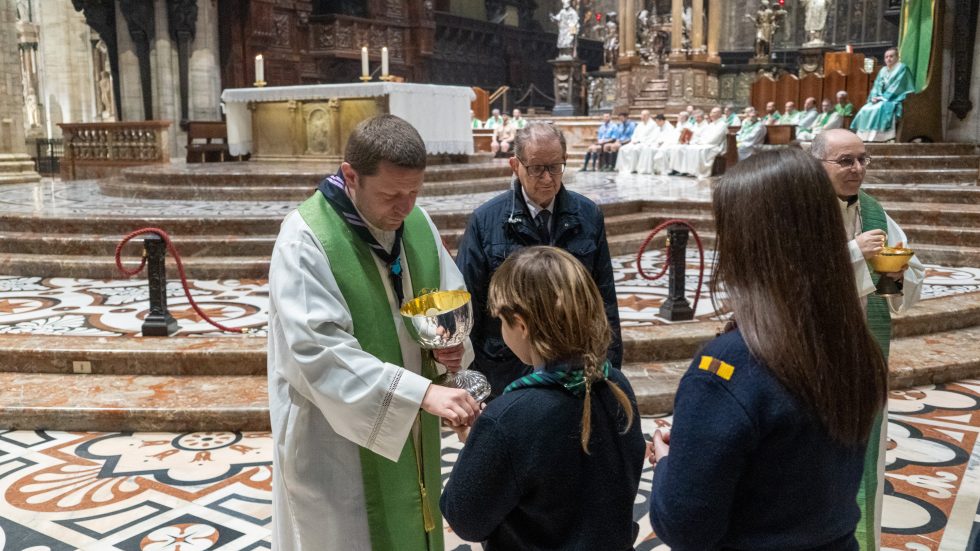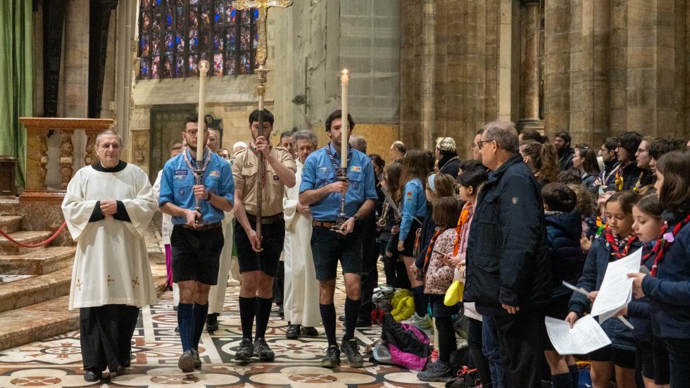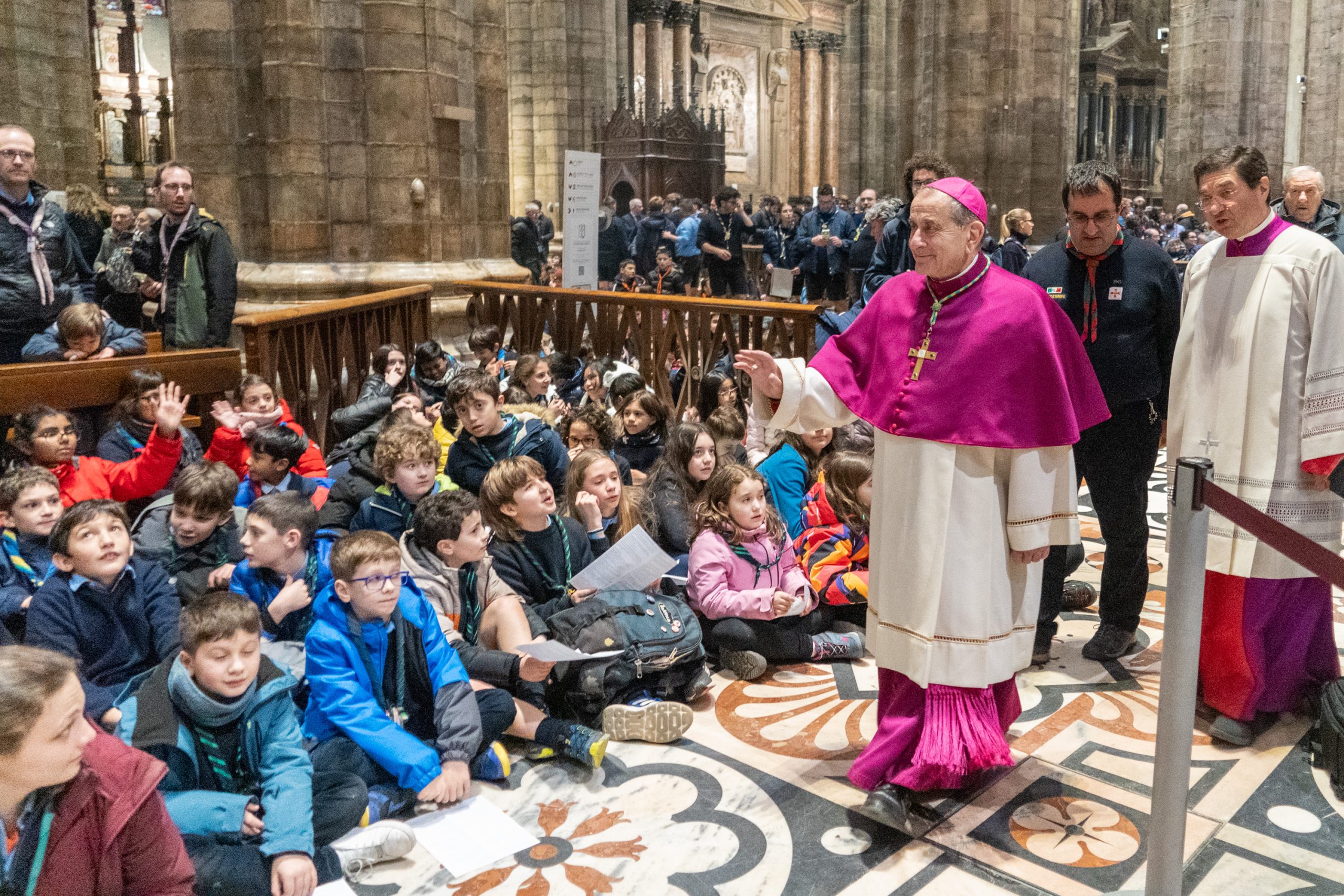 Mons. Delpini con gli scout arrivati in Duomo (Fotogramma)