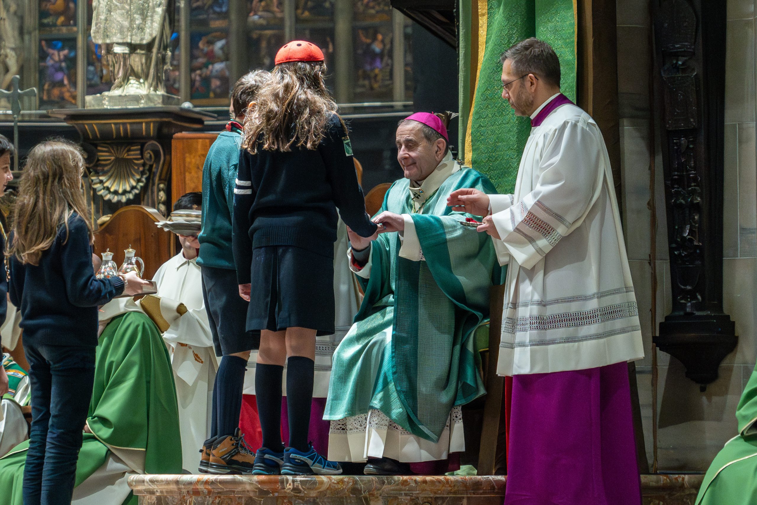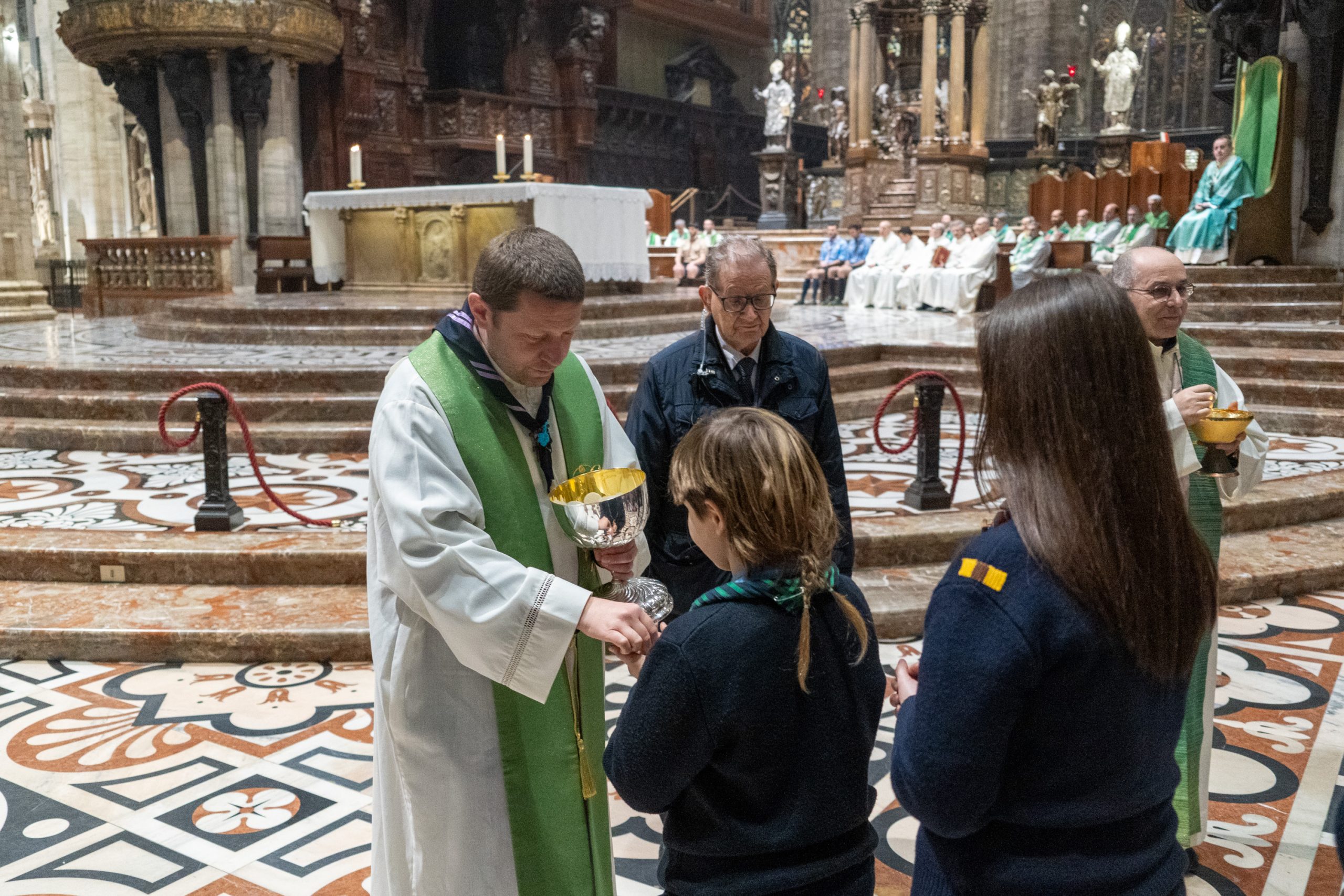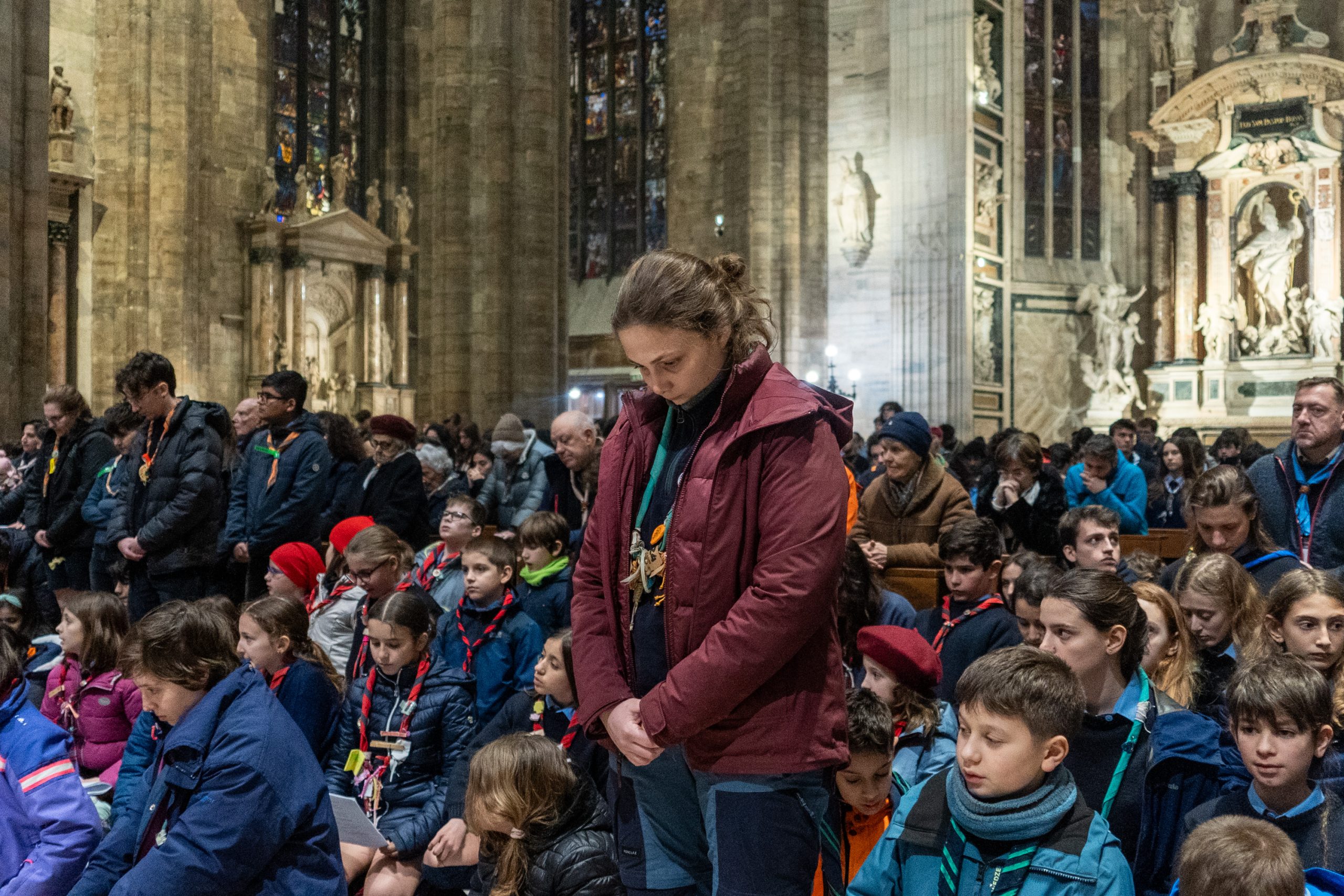 Mons. Delpini con gli scout arrivati in Duomo (Fotogramma)