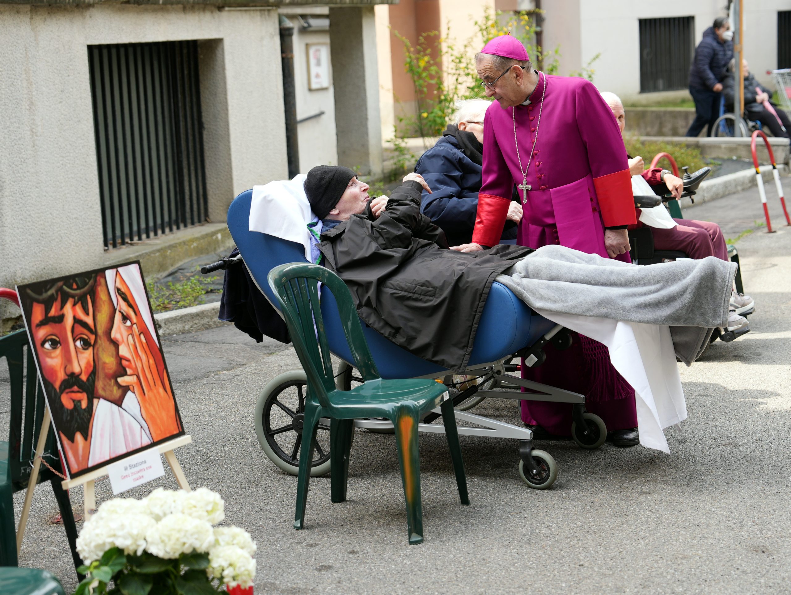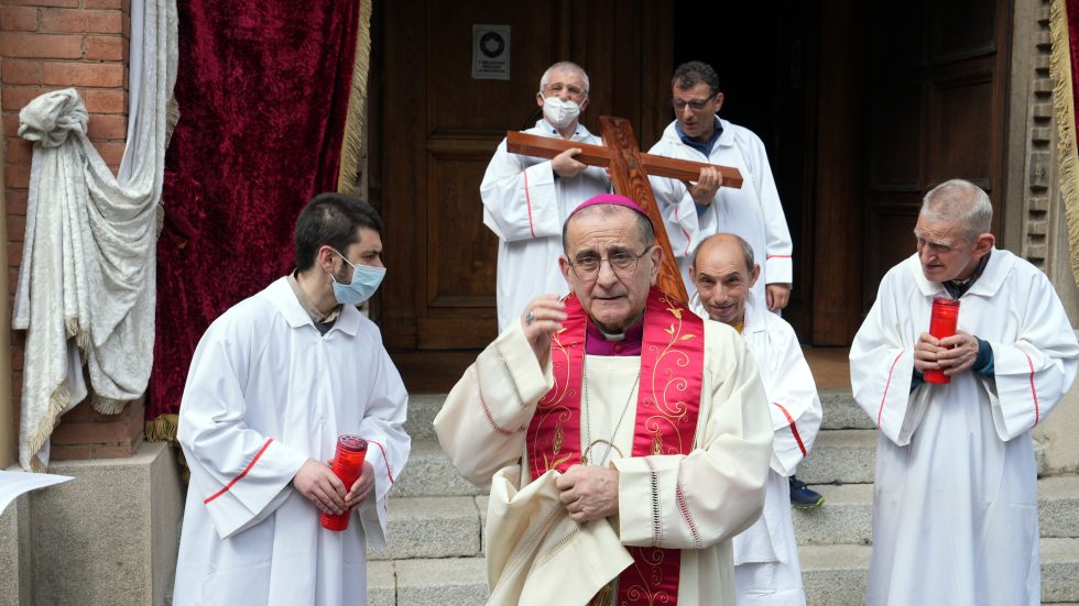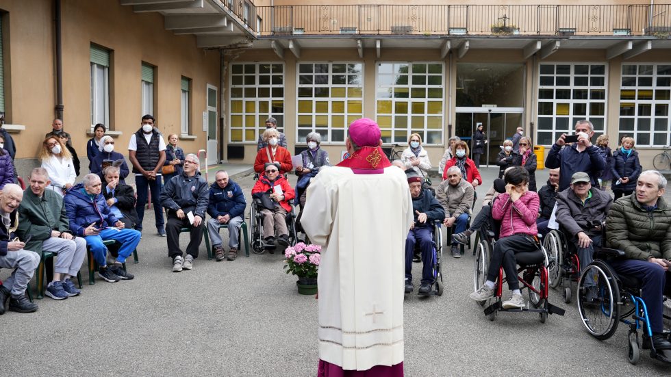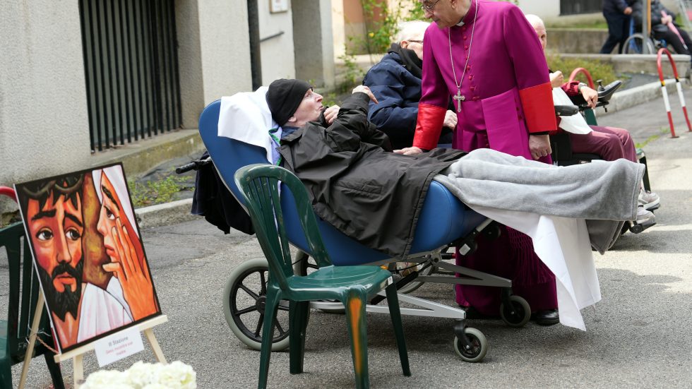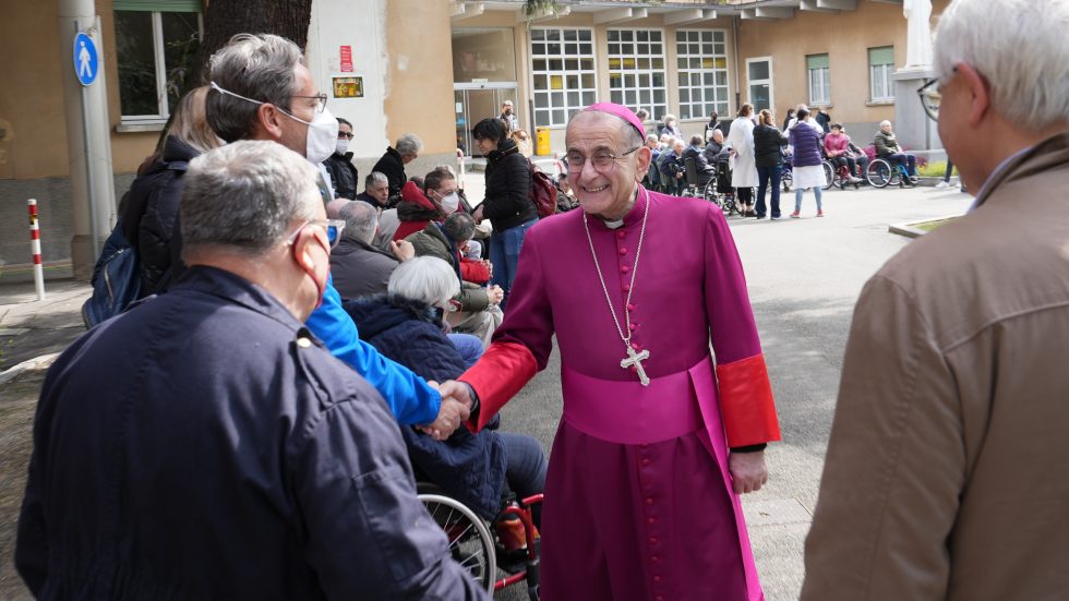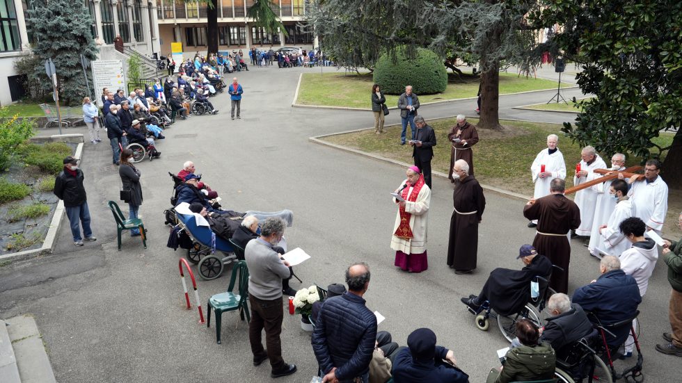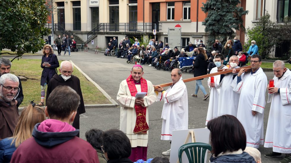 Mons. Delpini per la preghiera della Via Crucis con gli ospiti della Sacra Famiglia di Cesano Boscone (Ag. Fotogramma)