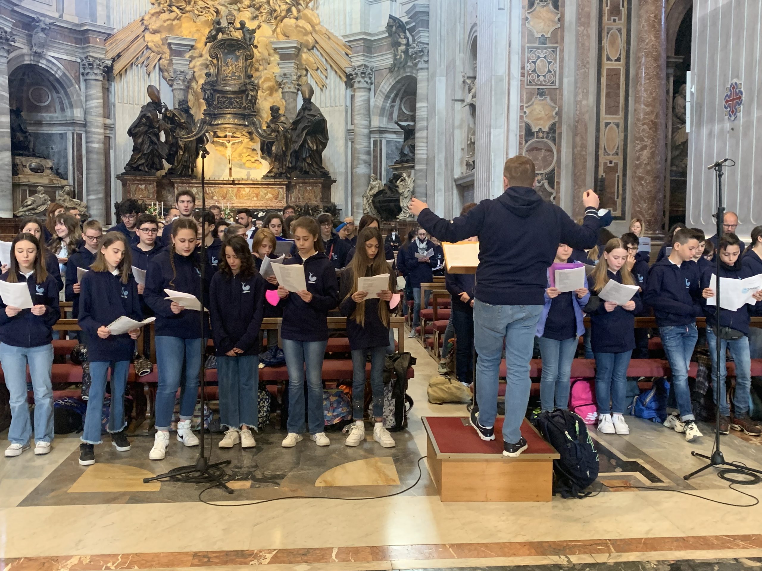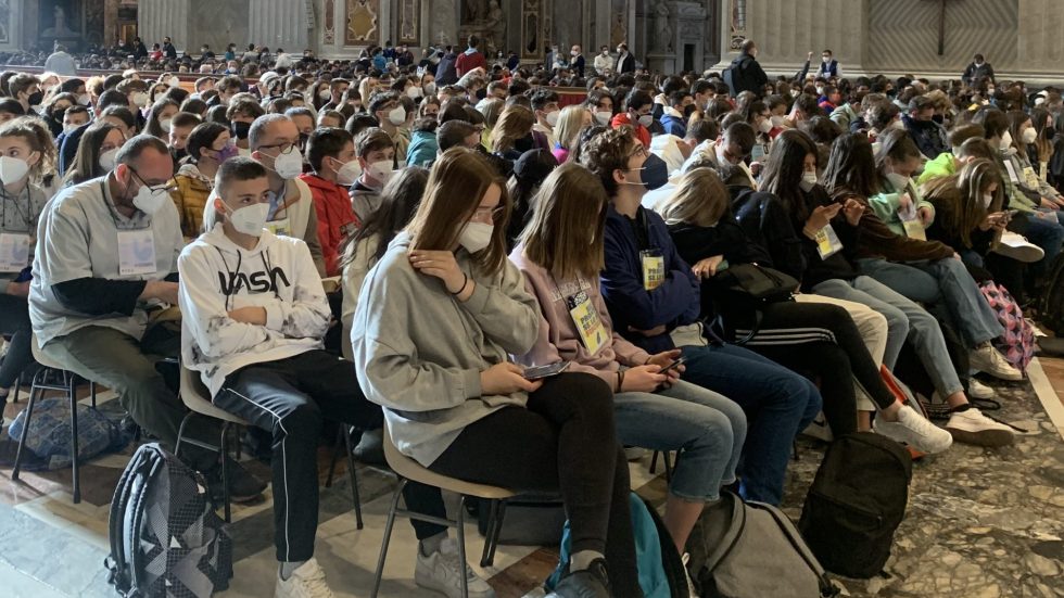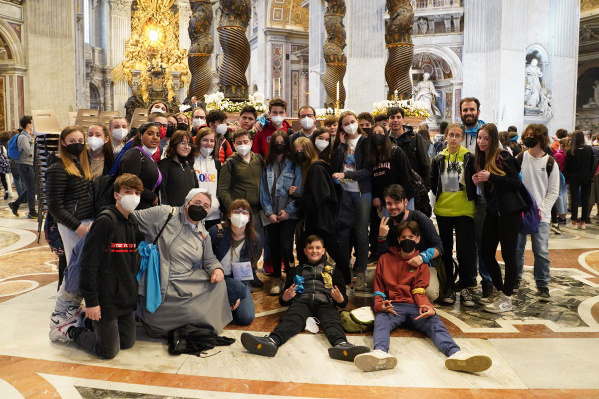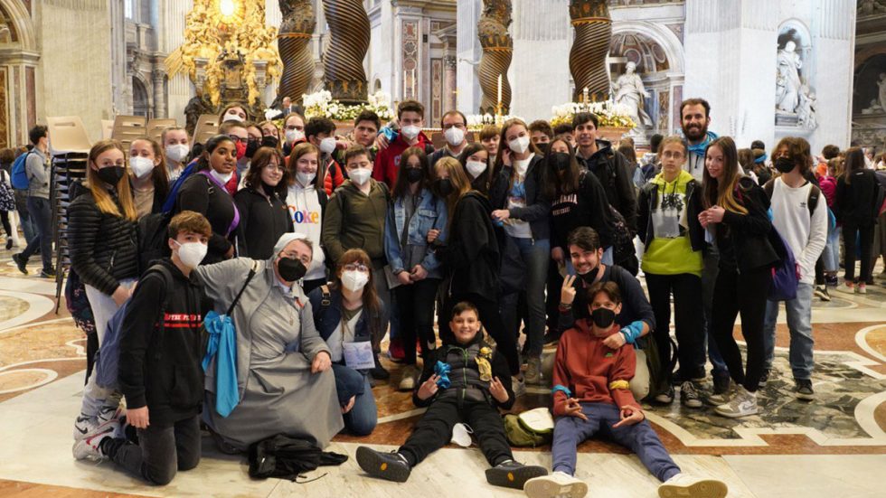 Un gruppo di ragazzi davanti all'altare di San Pietro