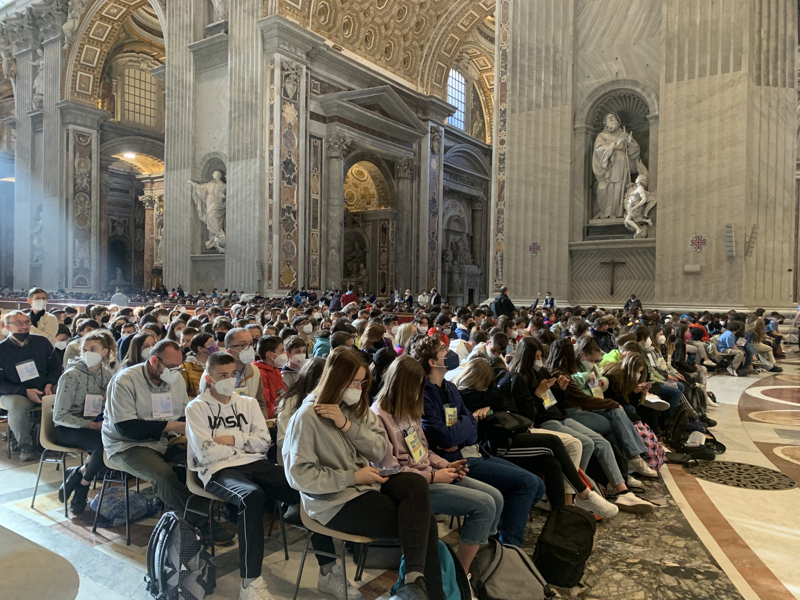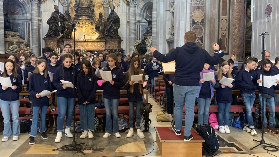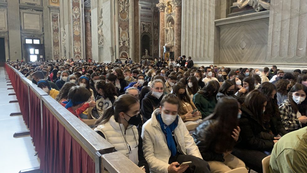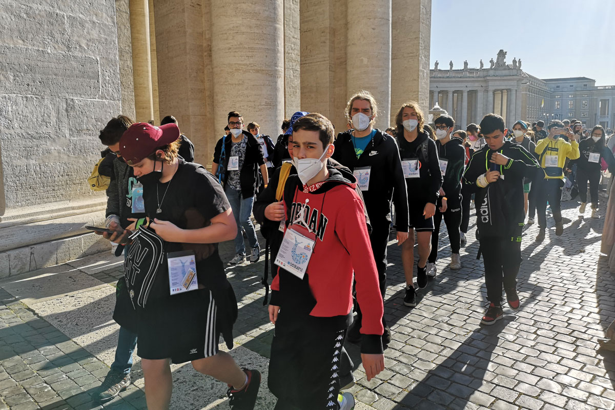 Un gruppo di ragazzi davanti all'altare di San Pietro