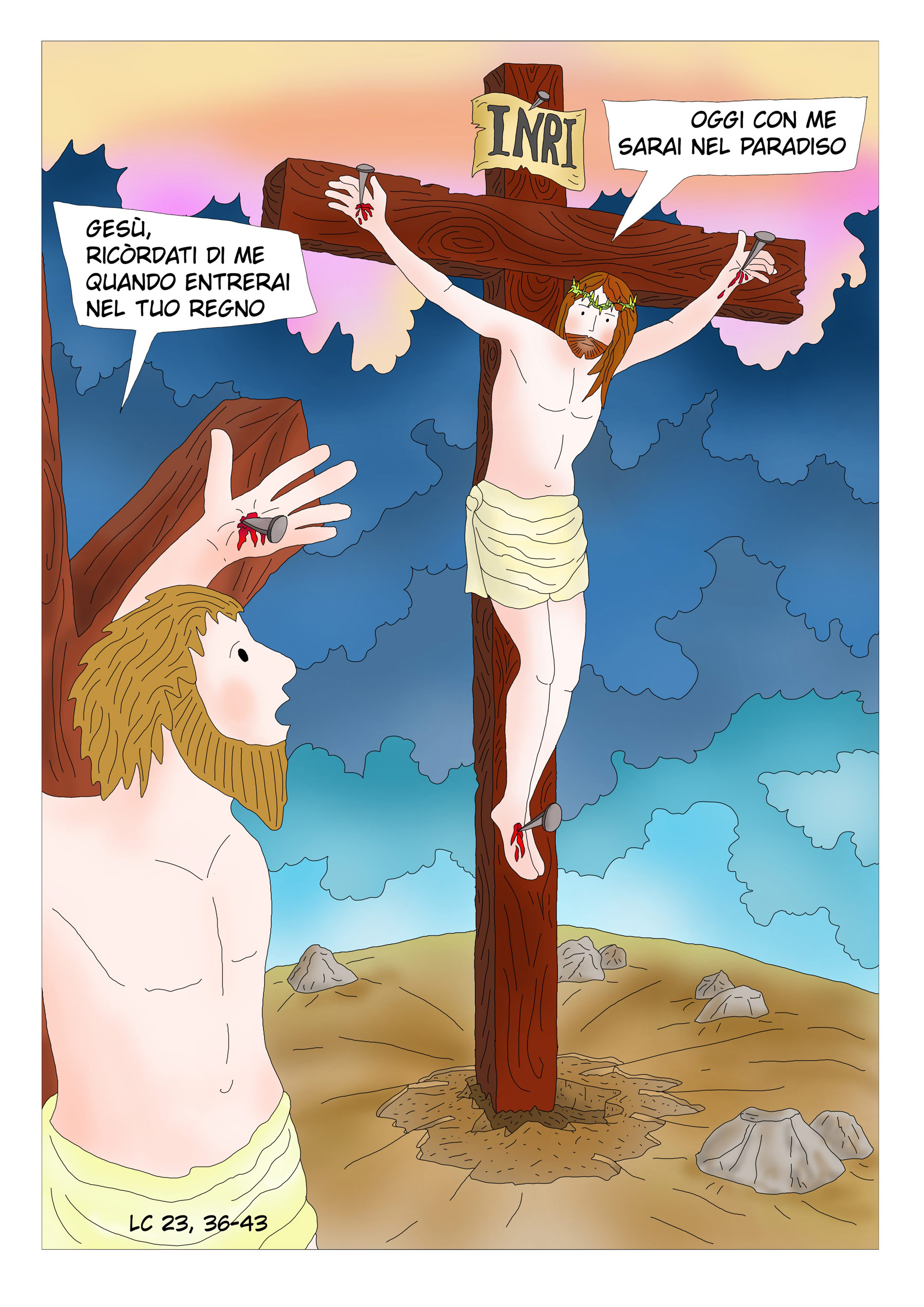 “Nostro Signore Gesù Cristo, Re dell’universo” e il nome bellissimo che porta questa ultima domenica dell’anno liturgico più comunemente detta Domenica di Cristo Re, Gesù che regna dalla croce esercitando la misericordia. L’episodio di Vangelo dell’evangelista Luca, è proprio quello della crocefissione di Gesù con i soldati che si prendono gioco di lui, insieme a uno dei due malfattori crocifissi con lui che lo insulta chiedendole di salvare se stesso e loro due. L’altro malfattore invece si rende conto che Gesù è Dio ed è Re perciò rimprovera il compagno ladrone : “ Non hai alcun timore di Dio, tu che sei condannato alla stessa pena ? Noi, giustamente, perché riceviamo quello che abbiamo meritato, per le nostre azioni; egli invece non ha fatto nulla di male “. Poi il malfattore pentito dice a Gesù : “ Gesù, ricordati di me quando entrerai nel tuo regno “. Gesù le risponde : “ In verità io ti dico: oggi con me sarai nel paradiso “.