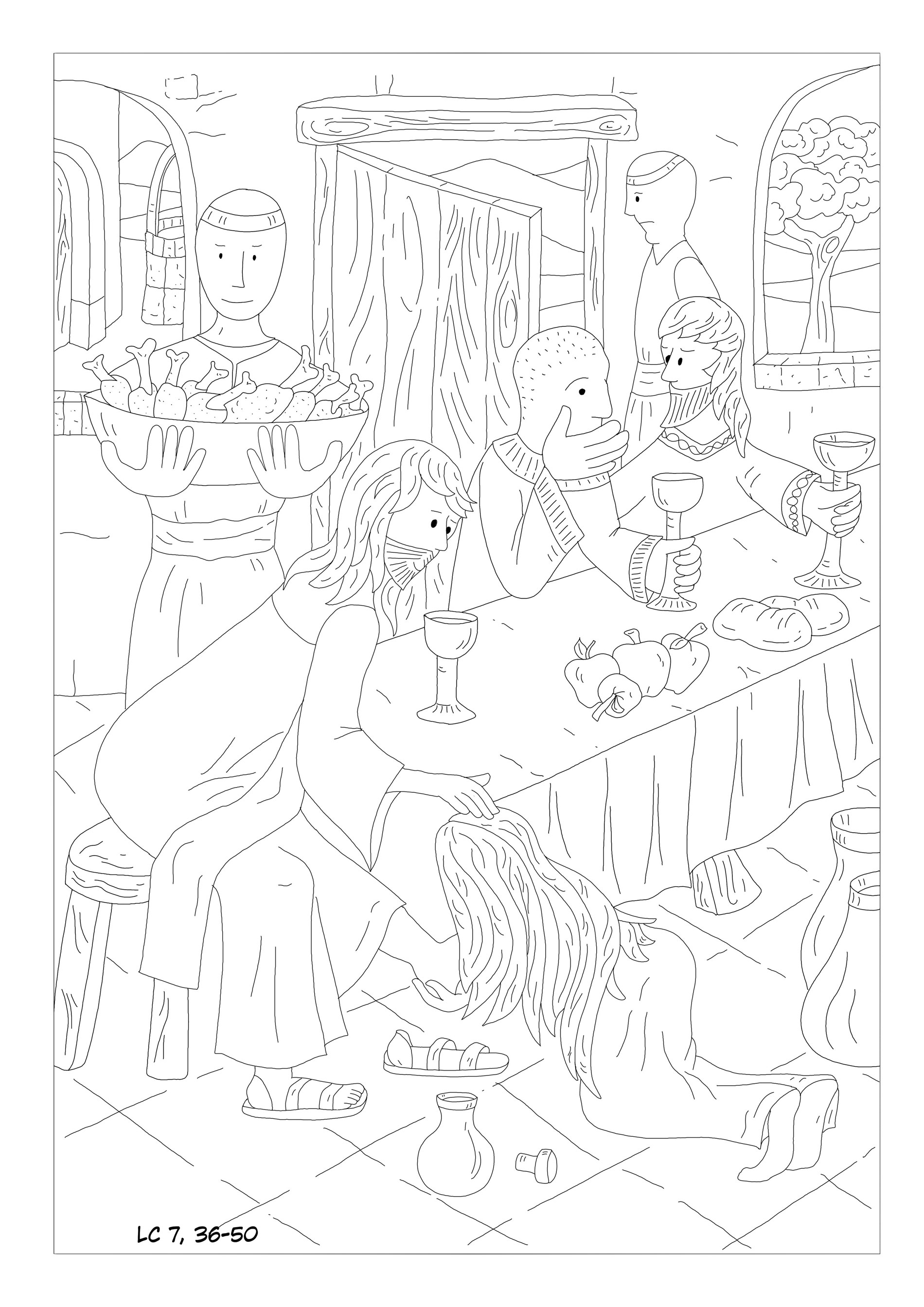 di un fariseo di nome Simone. Gesù è invitato a mangiare e, appena seduto a tavola, entra una