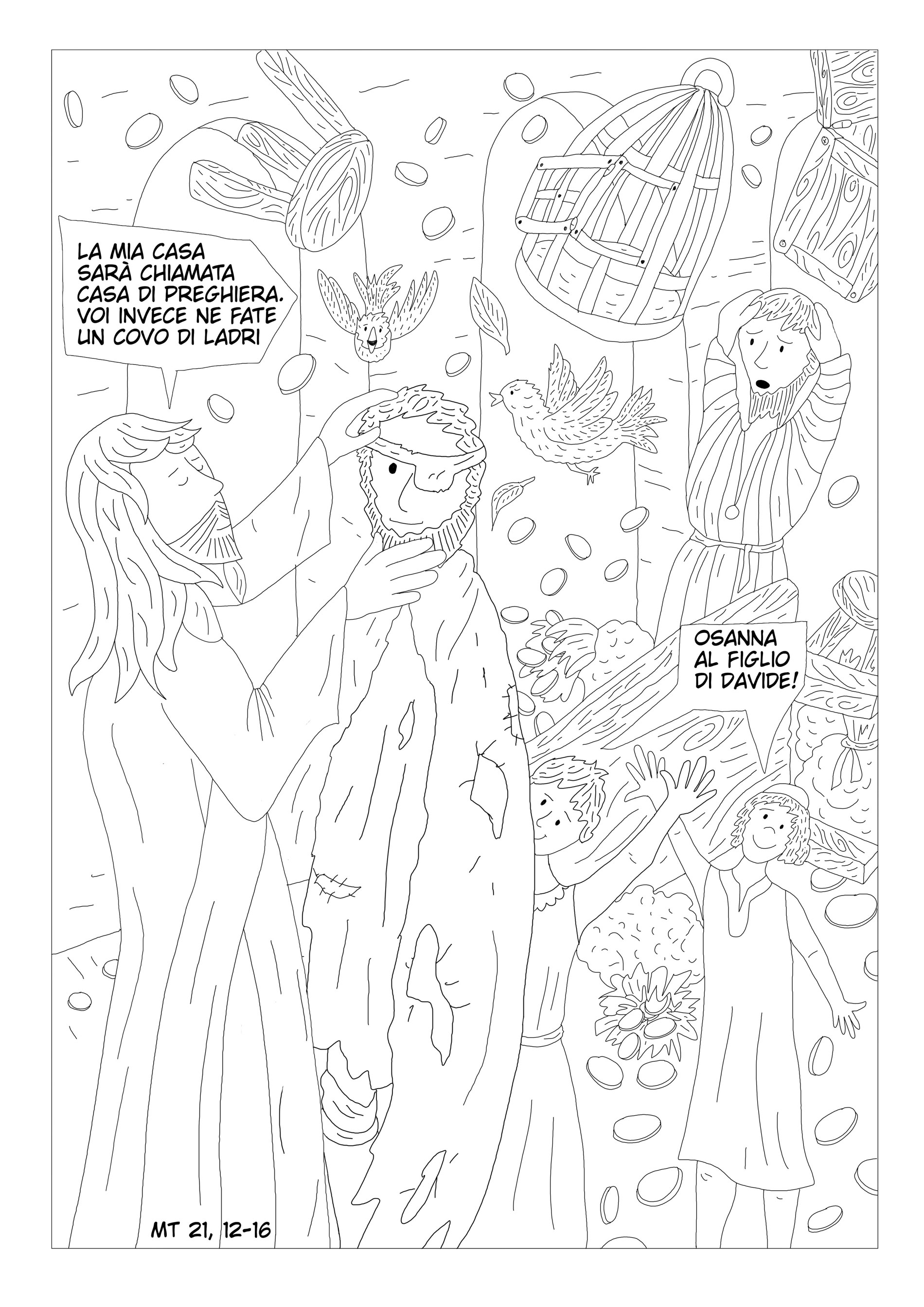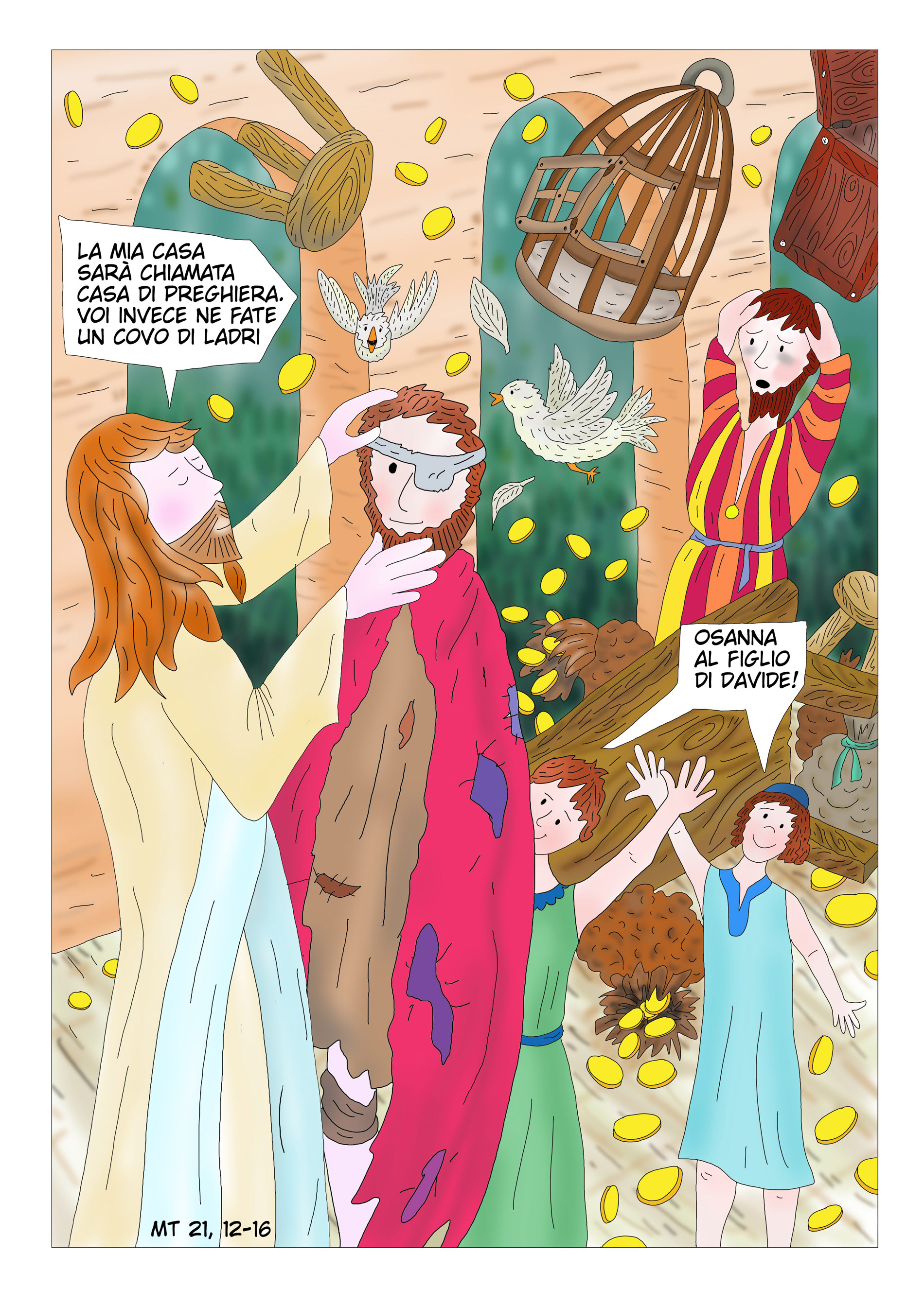 Gesù si arrabbia ! Si, nella decima domenica dopo la Pentecoste, Gesù entra nel tempio di Gerusalemme, vede che c’è un gran movimento di gente che vende e gente che compra animali che servono per il sacrificio a Dio…sembra il mercato…certo un clima del genere, non facilita la preparazione all’ascolto della Parola e alla preghiera e Gesù perde il controllo, scaccia tutti attirando l’attenzione su di Lui e dice citando il profeta Isaia : “ La mia casa sarà chiamata casa di preghiera. Voi invece ne fate un covo di ladri “. Poi Gesù immediatamente ritorna a concentrarsi sulla sua missione, e guarisce ciechi e storpi, i bambini meravigliati esplodono di gioia e acclamano “ Osanna al figlio di Davide! “. Questo non sfugge ai capi dei sacerdoti e agli scribi che si sdegnano e Gesù le dice citando il Salmo 8: “ Dalla bocca di bambini e di lattanti hai tratto per te una lode”.