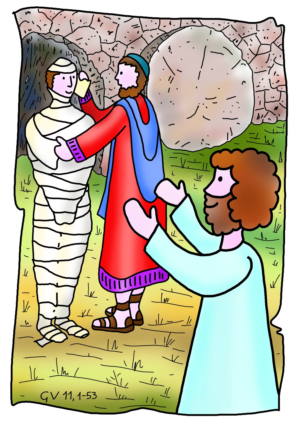 Quinta domenica di Quaresima, Domenica di Lazzaro, domenica che preannuncia gli eventi della Pasqua. L’evangelista Giovanni ci racconta di come Gesù si emoziona davanti al dramma della morte nella vicenda che si svolge a Betània a casa dei tre fratelli, Lazzaro, Marta e Maria, cari amici di Gesù. Lazzaro era malato e le sorelle, mandano ad avvisare Gesù che non si affretta a partire perché sa che questa malattia, servirà a far “risaltare” la gloria di Dio e il Figlio di Dio. Dopo due giorni Gesù decide di partire verso la casa dei suoi amici a Betània facendo borbottare i suoi discepoli che ritengono pericoloso il ritorno in Giudea dove volevano lapidarlo, ma Gesù risponde paragonando la sua vita ad una giornata lavorativa, per fare capire che è adesso che bisogna approfittare di lui che è la “Luce del mondo”. Poi Gesù dice apertamente: ” Lazzaro è morto e io sono contento per voi di non essere stato là, affinché voi crediate; ma andiamo da lui ” e Tommaso aggiunge: ” Andiamo anche noi a morire con lui”. Quando Gesù arriva, Lazzaro è nel sepolcro da quattro giorni…Marta gli corre incontro e dice a Gesù: ” Signore, se tu fossi stato qui, mio fratello non sarebbe morto! Ma anche ora so che qualunque cosa tu chiederai a Dio, Dio te la concederà”. Gesù le dice : ” Tuo fratello risorgerà”. Gli risponde Marta: ” So che risorgerà nella risurrezione dell’ultimo giorno “. Gesù le dice: ” Io sono la risurrezione e la vita; chi crede in me, anche se muore, vivrà; chiunque vive e crede in me, non morirà in eterno. Credi questo?”. Marta risponde: ” Sì o Signore, io credo che tu sei il Cristo, il Figlio di Dio, colui che viene nel mondo”. Detto questo, Marta va a chiamare Maria, sua sorella, che era in casa, anche lei gli va incontro, si getta ai suoi piedi e dice la stessa frase di Marta. Gesù, quando la vede piangere e piangere anche i Giudei che erano con lei, si commuove profondamente e, molto turbato domanda dove è il sepolcro e…scoppia in pianto. I Giudei fanno commenti sul fatto che Gesù poteva benissimo salvare il suo amico, visto che ha fatto tanti miracoli… Gesù si reca davanti al sepolcro e chiede che venga tolta la pietra ma Marta, gli fa notare che è già lì da quattro giorni e manda cattivo odore ma Gesù risponde: ” Non ti ho detto che, se crederai, vedrai la gloria di Dio?”. Tolgono la pietra, Gesù alza gli occhi e dice: ” Padre, ti rendo grazie perché mi hai ascoltato. Io sapevo che mi dai sempre ascolto, ma l’ho detto per la gente che mi sta attorno, perchè credano che tu mi hai mandato”. Detto questo Gesù grida a gran voce: ” Lazzaro, vieni fuori!”. Il morto esce tutto bendato e Gesù ordina di liberarlo. Molti Giudei credettero in Gesù ma i farisei riuniscono il sinedrio preoccupatissimi dei segni importanti che Gesù compie, tanto da pensare che presto la voce arriverà a Roma e verranno a distruggere la nazione e così, Caifa che era sommo sacerdote quell’anno, decide che è meglio che muoia solo Gesù piuttosto che tutta la nazione.