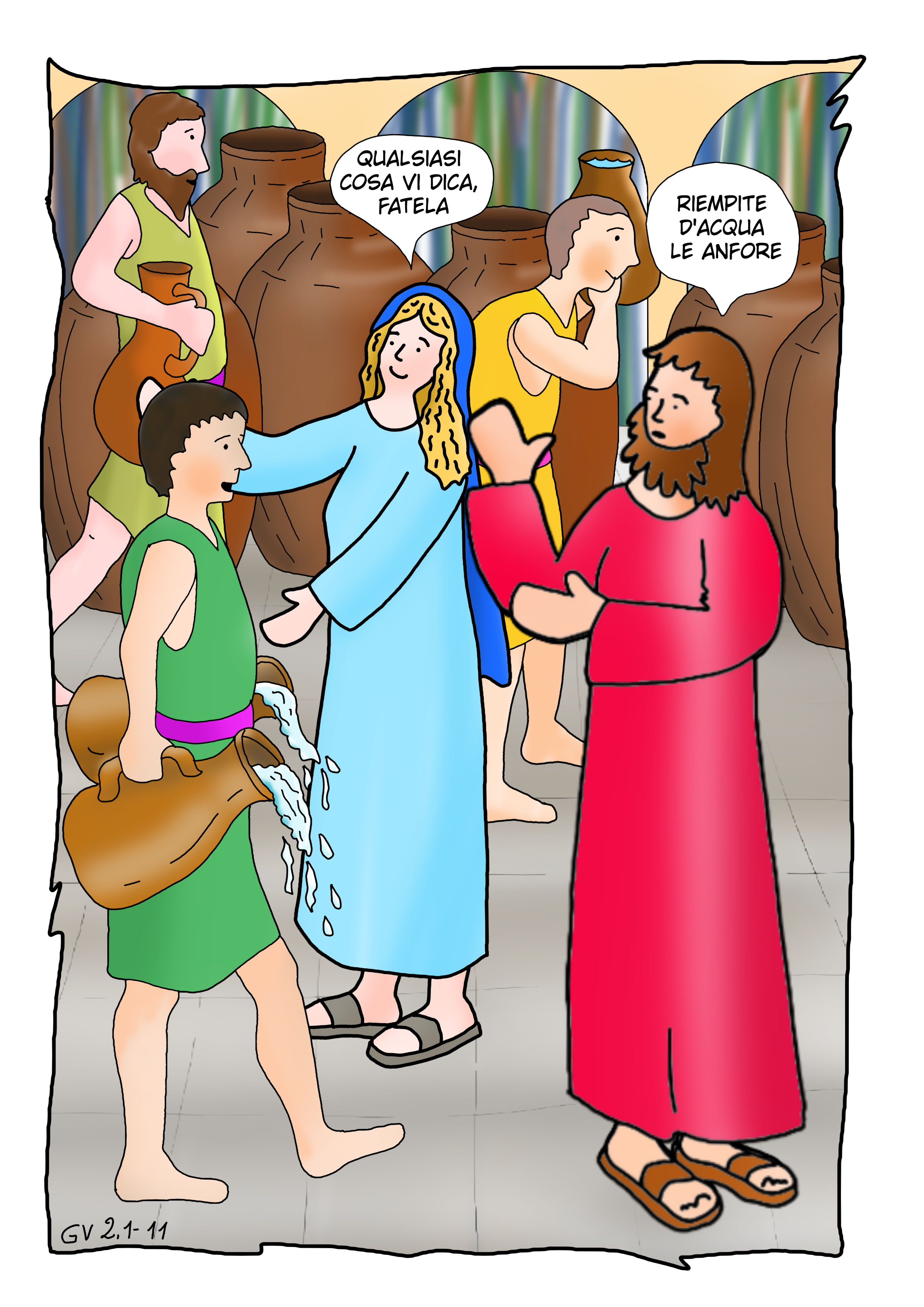 Seconda domenica dopo l’Epifania, la liturgia ci propone il primo miracolo di Gesù a Cana, durante un matrimonio, la mamma di Gesù, Maria, si accorge che manca il vino e invita Gesù a risolvere il problema. Gesù fa riempire dai servitori le sei anfore di acqua, ma quando il maestro di tavola assaggia, gusta un vino buonissimo. E’ così che Gesù si manifesta!