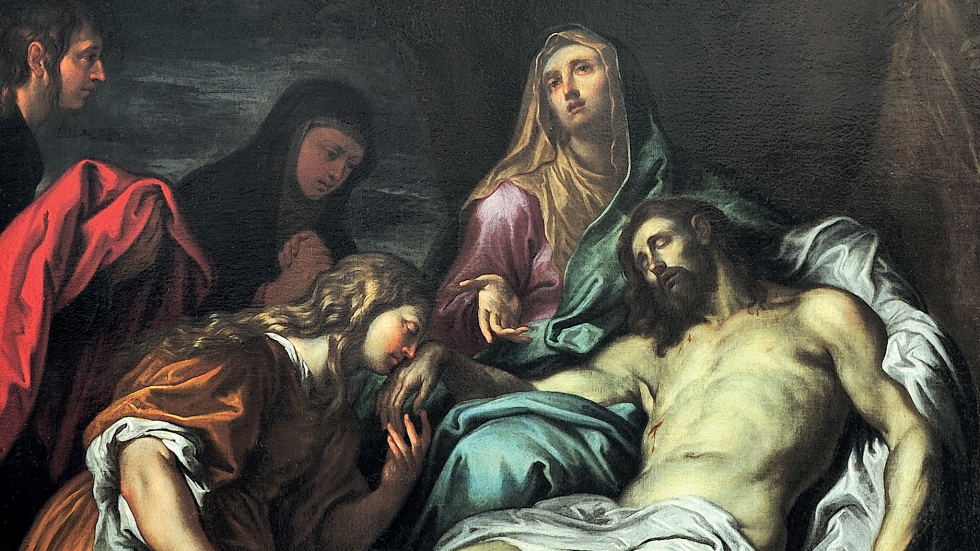 Altrettanto interessante è il quadro raffigurante il Compianto su Cristo morto: anche in questo caso, sulla base di nostre ricerche, possiamo “svelare” che la tela, di circa 130 centimetri d’altezza, è una pregevole copia di un celebre modello eseguito nel 1628 da Antoon Van Dyck per la chiesa delle beghine di Anversa (oggi nel museo di Belle arti), poi replicato dallo stesso maestro fiammingo in una versione più piccola (attualmente conservata al Prado di Madrid). Si può notare, tuttavia, come questo dipinto di Brugherio appaia “specchiato” rispetto all’originale. Forse, è la nostra ipotesi, perché deriva direttamente da un’altra copia del Compianto di Van Dyck, quella eseguita da Johann de Pay per la parrocchiale di San Pietro a Monaco di Baviera, considerata miracolosa perché nel 1783 il viso della Madonna fu visto lacrimare: motivo per cui la venerata immagine si diffuse in tutta Europa attraverso un gran numero di incisioni e a varie “repliche” pittoriche (e, tra quelle a nostra conoscenza, questa di Brugherio è senza dubbio tra le più belle).