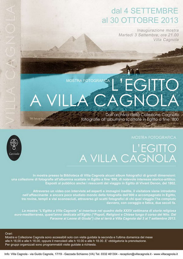 Dal 4 settembre al 30 ottobre (con inaugurazione martedì 3 settembre, alle 21), in mostra presso la Biblioteca di Villa Cagnola a Gazzada alcuni album fotografici di grandi dimensioni. Si tratta di una collezione di fotografie all’albumina scattate in Egitto a fine Ottocento, di notevole interesse storico-artistico. Esposti al pubblico anche i resoconti di viaggio in Egitto di Vivant Denon (1802).