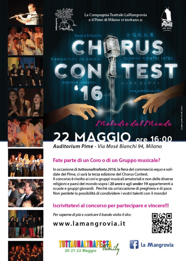 Si apre ufficialmente di bando di concorso per la terza edizione del Chorus Contest 2016, la competizione canora aperta a tutti i cori delle differenti religioni e culture. A organizzarlo è l’Associazione Culturale La Mangrovia, facente parte dell’animazione missionaria del Pontificio Istituto Missioni Estere di Milano. L’evento è in programma il 22 maggio, alle 16, presso l’Auditorium del Pime (via Mosè Bianchi 94, Milano), in chiusura della Fiera del commercio equo “Tuttaunaltrafesta Family 2016”, organizzata dall’Ufficio Mondialità.