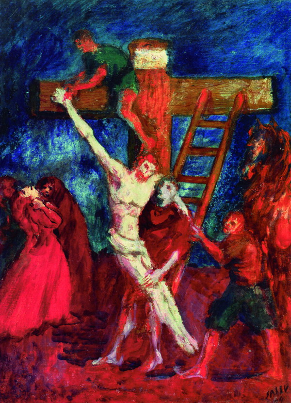 «Il tema della morte di Cristo è ricorrente nel mio lavoro, con un’insistenza ossessiva». Quasi una confessione, questa di Aligi Sassu, allora quarantacinquenne. La confessione di chi, giunto nel mezzo del proprio cammino umano ed artistico, considerava quanto di più significativo aveva fatto e avrebbe ancora potuto fare, eliminato ogni orpello intellettuale, depurata ogni scoria decorativa. «È questo un tema – continuava infatti l’artista, fieramente laico, irrinunciabilmente cristiano – attorno al quale la mia fantasia lavora, quasi un configurarsi dell’urgente, tragica condizione dell’uomo, dell’uomo della nostra epoca. Quel ponte che dalla nascita dell’uomo ci conduce passo passo alla morte è come una vena viva di sangue che si rivela in tutti i suoi elementi di sacro, di tragico, di grottesco, ma sempre lo specchio della nostra umanità, della nostra ansia del vero, del nostro essere uomini veri tra gli altri uomini veri…».