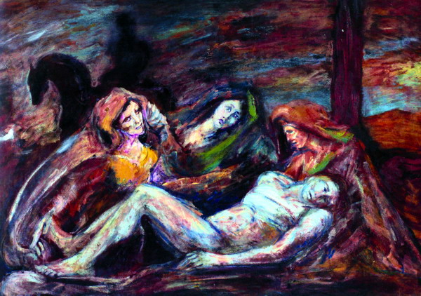 Nudi, già, come è nudo il Cristo deposto dalla croce. Corpo straziato, umiliato, ucciso, in cui Aligi Sassu, che per il suo aperto antifascismo ha subito anni di carcere e di confino, più e più volte riassume nel tempo infame della guerra tutti gli strazi, tutte le umiliazioni, tutti i massacri inflitti a un’umanità innocente. La sua pennellata insolitamente densa, in quei mesi di tragedia, è il grido della Maddalena sul Golgota. Il suo segno fattosi duro, il pianto composto della Vergine. E più che agli uomini, Sassu, questo socialista senza partito, questo cristiano senza Chiesa, come lo aveva definito Ignazio Silone, sembra voler chiedere direttamente a Dio il perchè di tanto male, le ragioni di un odio così devastante…