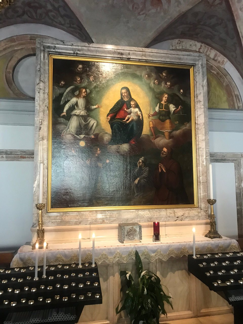 Sempre all’ultima parte del Cinquecento è da far risalire la grande tela posta dietro l’altare, per cui si fanno i nomi dei fratelli Campi, in cui la Vergine col Bambino è attorniata da cherubini e dagli arcangeli Michele e Gabriele, mentre ai suoi piedi si vede un uomo prima malato e prostrato, poi guarito e orante. Forse si tratta dello stesso Carlo d’Amboise. Ma in fondo è l’immagine di noi tutti, bisognosi di essere risanati, nello spirito ancora prima che nel fisico, alla fonte della vera vita.