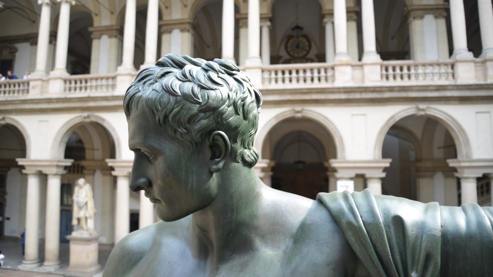 Ciò nonostante, quella statua era talmente bella che lo stesso Eugenio di Beauharnais, viceré del Regno d’Italia e figliastro di Napoleone, ne commissionò a Canova una copia esatta in bronzo, per innalzarla a Milano in un luogo di grande evidenza, come piazza Duomo o l’attuale piazza Fontana. La caduta dell’imperatore francese, tuttavia, bloccò questo progetto, e anche la splendida statua bronzea del «Napoleone pacificatore» finì in cantina, questa volta all’Accademia di Brera. Da dove fu tolta solo nel 1859, grazie alla visita a Milano di un altro Napoleone, il Terzo, per essere collocata al centro del cortile braidense, dove ancor oggi si trova.