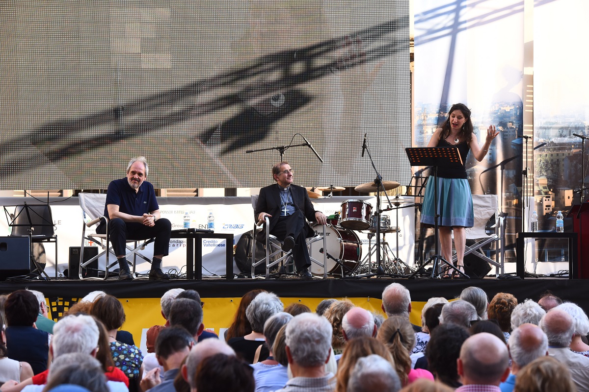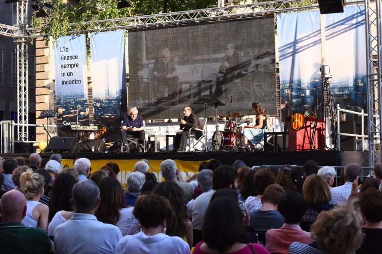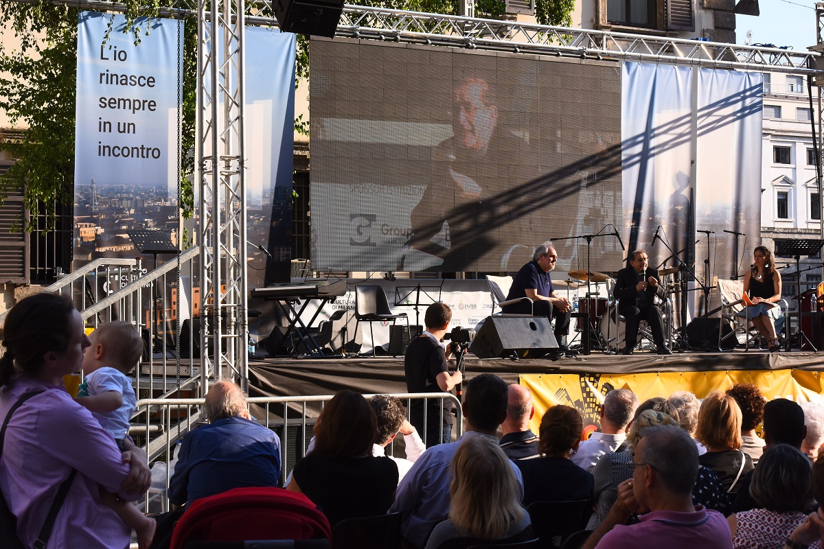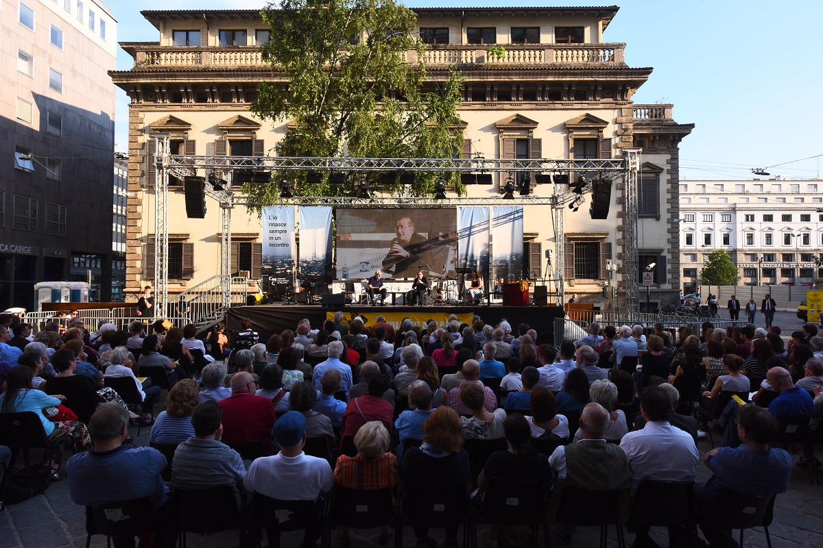 Piazza Beccaria è il teatro aperto sotto il sole, a sera, della Milano che non ti aspetti: gremita di tanta gente, riunita non per le prove del vicino concerto alla moda, ma per ascoltare il brano famosissimo del capitolo XXIII dei Promessi Sposi, con l’incontro, appunto, tra l’Innominato e il cardinale Federico Borromeo.