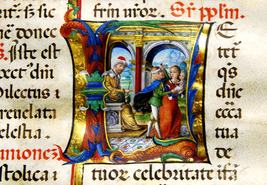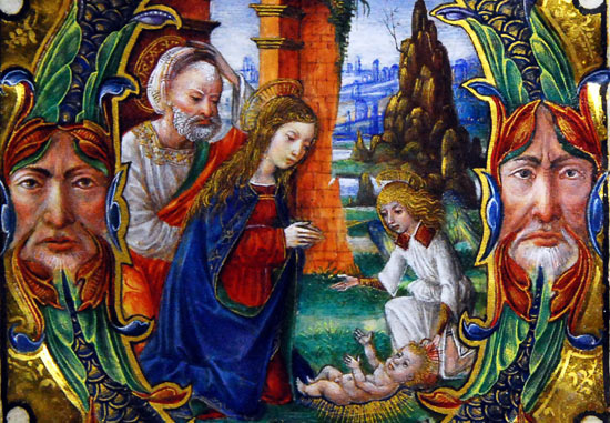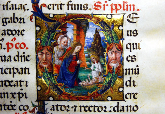 Una meraviglia, un’autentica delizia per gli occhi. Si tratta delle miniature che ornano il Messale Arcimboldi, una delle gemme più preziose di quel tesoro di antichi codici conservato nella Biblioteca Capitolare del Duomo di Milano. Un’opera monumentale, bellissima, databile all’ultimo quinquennio del XV secolo, nota agli studiosi per la celebre raffigurazione a tutta pagina dell’investitura imperiale di Ludovico il Moro, ma pressochè sconosciuta al grande pubblico. Anche a quello, peraltro, appassionato delle cose d’arte… Una meraviglia, un’autentica delizia per gli occhi. Si tratta delle miniature che ornano il Messale Arcimboldi, una delle gemme più preziose di quel tesoro di antichi codici conservato nella Biblioteca Capitolare del Duomo di Milano. Un’opera monumentale, bellissima, databile all’ultimo quinquennio del XV secolo, nota agli studiosi per la celebre raffigurazione a tutta pagina dell’investitura imperiale di Ludovico il Moro, ma pressochè sconosciuta al grande pubblico. Anche a quello, peraltro, appassionato delle cose d’arte… In adorazione Per questo, con l’assistenza di Laila Gagliano e di Stefano Malaspina, bibliotecari del Capitolo Metropolitano, abbiamo voluto sfogliare proprio questo magnifico volume rinascimentale, alla ricerca, in particolar modo, di immagini “natalizie”. E quel che abbiamo trovato, lo si può vedere, è stato superiore a qualsiasi aspettativa… A cominciare dalla bellissima raffigurazione della Natività, dai colori smaglianti e dal segno dolcissimo, che nello spazio di pochi centimetri e all’interno di un capolettera ci restituisce l’atmosfera sognante, quasi fiabesca, e allo stesso tempo carica di commozione, della venuta al mondo del Bambino Gesù.Maria, dai lunghi cappelli non coperti dal velo, contempla in ginocchio suo Figlio, le mani giunte in preghiera. E il Divino Infante, adagiato per terra, risplendente di luce, nudo di quella nudità che rivela la sua piena natura umana e divina, le sorride alzando le minuscole braccia verso la Madre. Quasi a sorreggere il capo di Gesù, ecco un angelo dalla tunica bianca, anch’egli prono, in adorazione. Come adorante, del resto, è Giuseppe che si sporge dietro la sua sposa, canuto, la barba grigia, proprio come la tradizione voleva fosse ritratto il fedele padre putativo: bellissimo il gesto con cui l’uomo si porta una mano alla testa, come per levarsi il copricapo, un turbante all’orientale, in segno di rispetto e di devozione davanti al Figlio di Dio. Il mistero dell’Incarnazione La scena si svolge all’aperto, e al posto della grotta o della stalla, secondo i canoni diffusi in epoca rinascimentale, ecco invece i resti di un antico edificio, simbolo di quell’epoca pagana ormai decaduta e al tramonto, crollata su se stessa, che Cristo è venuto a riscattare infondendo alla storia dell’umanità nuova vita. Si noti, inoltre, il paesaggio, semplice e straordinario a un tempo, per il modo in cui l’artista ha saputo rendere la piacevolezza della natura, rivestendola tuttavia di allusivi significati simbolici. Non è un caso, crediamo infatti, che quella roccia s’imponga in modo così evidente nel piccolo spazio di questa Natività, e proprio sopra la figura del Bambino Gesù. Come già Leonardo da Vinci nella sua Vergine delle rocce – e si osservi quanta misura, quanta armonia leonardesca vi sia in questa miniatura! -, anche qui, in quel monte roccioso, paiono riecheggiare le meditazioni stesse dei Padri della Chiesa sul mistero dell’Incarnazione, così ben riassunte, ad esempio, nelle parole di san Giovanni Damasceno: «È sorto splendente il monte del Signore, che oltrepassa e supera ogni collina e ogni montagna, l’altezza degli angeli e degli uomini: da esso senza mano umana, si è degnata di staccarsi la pietra angolare». Quella pietra angolare che è poi Cristo stesso Il giuramento nella cattedrale Non da meno, per splendore, è la miniatura che illustra poco più avanti l’adorazione da parte dei Magi, così come quella relativa alla strage degli innocenti. Ma tutto il codice, lo si diceva, è tra i più belli e i più importanti della fine del Quattrocento: e non solo in terra lombarda. Committente di un tale capolavoro fu Antonio Guido Arcimboldi, arcivescovo di Milano tra il 1488 e il 1497, durante la signoria degli Sforza, a cui fu sempre fortemente legato. L’occasione, appunto, fu quella dell’investitura del Moro, che lo stesso arcivescovo consacrò duca nel 1495 in una fastosa celebrazione in cattedrale: e proprio su questo messale, probabilmente, Ludovico prestò il suo solenne giuramento di fedeltà all’imperatore. A realizzarlo, una delle botteghe specializzate milanesi, tra le migliori d’Europa nell’arte della miniatura. Due, forse tre mani diverse realizzarono le illustrazioni: tra loro, si ipotizza, anche il giovane Matteo da Milano. Artisti, comunque, partecipi della grande tradizione lombarda e ormai consapevoli delle novità che Leonardo andava introducendo proprio in quegli anni, durante il suo soggiorno ambrosiano La Biblioteca più antica di Milano Alla Biblioteca del Capitolo Metropolitano di Milano, la prima a nascere a Milano, si accede dal Palazzo dei Canonici (Piazza Duomo, 16): è aperta nei martedì non festivi dalle ore 9 alle 12.30 e dalle 14.30 alle 17.30. La consultazione dei libri e dei documenti dell’archivio è consentita a studiosi e ricercatori. Per informazioni: tel. 02.72008540; email bibarchimetromi@virgilio.it –