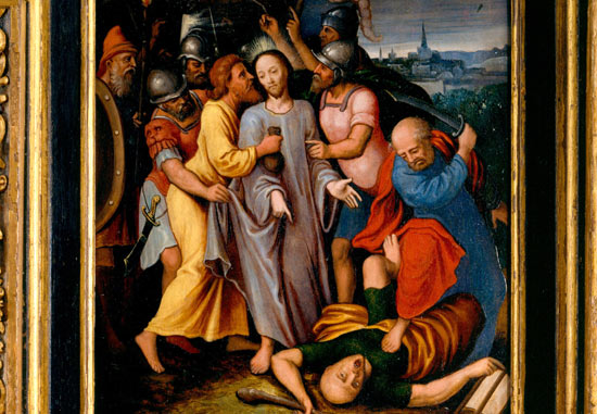 Curioso, quel colore giallo. Giuda s’avvicina a Gesù per tradirlo con un bacio, stringendo ancora in pugno la sacchetta con i trenta denari, mentre attorno a loro soldati e uomini armati sono pronti ad intervenire. Pietro reagisce, e posta mano alla spada colpisce Malco, il servo del sommo sacerdote. Cristo, invece, le mani abbassate, si lascia catturare dai suoi carnefici, come agnello destinato al sacrificio. Il traditore pare sorpreso, perplesso, ma non recede dal suo disgraziato intento: ha la barba e i capelli rossicci, e indossa una tunica piuttosto vistosa. Di colore giallo, appunto, simbolo di tradimento, di falsità, copia “opaca”, e quindi fasulla, dello splendore dell’oro…