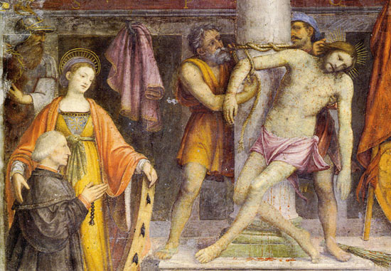 Questa di Giuda è solo una piccola formella di quel bellissimo e monumentale polittico ligneo esposto al Museo Diocesano di Milano, realizzato intorno alla metà del XV secolo da una bottega di Anversa per una cappella della chiesa di San Giorgio ad Annone Brianza. Volendo intraprendere un itinerario fra alcune delle molte opere d’arte che nel capoluogo lombardo “raccontano” la Passione di Gesù, può essere interessante partire proprio da questo, poco noto, capolavoro: sia perchè la grande ancona, scolpita e dipinta, è interamente dedicata a questo tema, sia perchè presenta alcuni particolari iconografici singolari e interessanti. Curioso, quel colore giallo. Giuda s’avvicina a Gesù per tradirlo con un bacio, stringendo ancora in pugno la sacchetta con i trenta denari, mentre attorno a loro soldati e uomini armati sono pronti ad intervenire. Pietro reagisce, e posta mano alla spada colpisce Malco, il servo del sommo sacerdote. Cristo, invece, le mani abbassate, si lascia catturare dai suoi carnefici, come agnello destinato al sacrificio. Il traditore pare sorpreso, perplesso, ma non recede dal suo disgraziato intento: ha la barba e i capelli rossicci, e indossa una tunica piuttosto vistosa. Di colore giallo, appunto, simbolo di tradimento, di falsità, copia “opaca”, e quindi fasulla, dello splendore dell’oro…Questa di Giuda è solo una piccola formella di quel bellissimo e monumentale polittico ligneo esposto al Museo Diocesano di Milano, realizzato intorno alla metà del XV secolo da una bottega di Anversa per una cappella della chiesa di San Giorgio ad Annone Brianza. Volendo intraprendere un itinerario fra alcune delle molte opere d’arte che nel capoluogo lombardo “raccontano” la Passione di Gesù, può essere interessante partire proprio da questo, poco noto, capolavoro: sia perchè la grande ancona, scolpita e dipinta, è interamente dedicata a questo tema, sia perchè presenta alcuni particolari iconografici singolari e interessanti. E già che siamo nelle sale dei Chiostri di Sant’Eustorgio, possiamo fare un , rispetto all’episodio del bacio di Giuda, e ammirare quel delizioso dipinto di Fede Galizia (una delle poche donne che è riuscita a imporsi per la sua arte nelle epoche passate) che raffigura Cristo nell’orto degli ulivi. Ispirata a un celebre dipinto del Correggio, questa tavola, databile agli inizi del Seicento, rivela un’atmosfera ancora più seducente, splendida nello scorcio dell’angelo, luminosa nel volto del Messia.Se il quadretto di Galizia, con i suoi quaranta centimetri di lato, era destinato alla meditazione personale e privata (“dipinto da capoletto”, infatti, è definito), lo stesso soggetto venne invece affrontato con proporzioni ben maggiori da Giovan Paolo Lomazzo nella tela che è oggi conservata nella chiesa San Carlo al Corso, dove ora possiamo trasferirci nel nostro breve percorso milanese. La sua Orazione nell’orto, infatti, misura oltre due metri di altezza e si ispira ai modelli di Michelangelo e di Gaudenzio Ferrari, attestando così la complessa cultura figurativa del nostro pittore. Commovente la “duplice” storia che accompagna quest’opera: essa, infatti, venne commissionata dal poeta, e politico, Giuliano Gosellini per la scomparsa del giovane figlio Agrippa, a cui dedicò anche dei versi di struggente bellezza; e fu probabilmente l’ultima opera realizzata dal Lomazzo prima della primavera del 1572, quando cioè, appena trentenne, fu colpita da cecità. Altre immagini della Passione ci attendono in quello scrigno della pittura tardorinascimentale che è la chiesa di San Maurizio Maggiore in corso Magenta, dove dal 1522, e per un decennio, operò Bernardino Luini e la sua attivissima bottega. La nostra attenzione è attirata, in particolar modo, dal Cristo alla colonna, davanti al quale santa Caterina d’Alessandria (riconoscibile per l’immancabile ruota uncinata, a ricordo del suo martirio) accompagna colui che volle questa grandiosa impresa decorativa, quell’Alessandro Bentivoglio che aiutò Francesco II Sforza a riprendere il dominio di Milano (sua figlia, la ben nota suor Alessandra, anch’essa più volte ritratta su queste pareti, fu badessa di questo stesso Monastero Maggiore). Infine, tra le numerose Crocifissioni conservate nelle chiese milanesi, si segnala quella di Giulio Campi presente nella basilica di Santa Maria della Passione. Una pala, eseguita verso il 1560, che si apprezza per la sua verità tragica, enfatizzata dal bellissimo cielo fattosi d’improvviso oscuro e che contrasta con il livore del Cristo in croce. E mentre le fronde degli alberi si agitano in un vento impetuoso, i bellissimi profili della Maddalena, di Giovanni e degli altri personaggi sul Golgota si stagliano in una luce drammatica, ma che sembra già annuncio dello splendore della Resurrezione. –