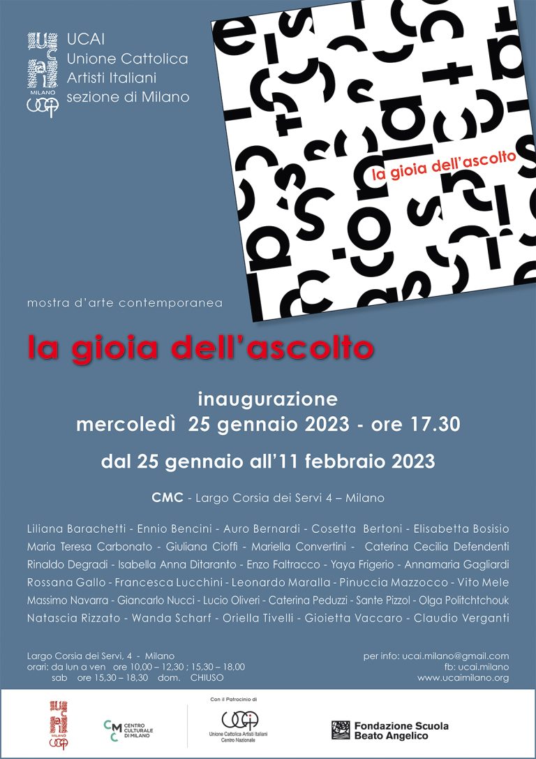 «La gioia dell’ ascolto» è il titolo della nuova mostra collettiva organizzata dalla Sezione di Milano dell’Ucai (Unione cattolica artisti italiani) e aperta presso il Centro culturale di Milano (Largo Corsia dei Servi, 4) fino al prossimo 11 febbraio.